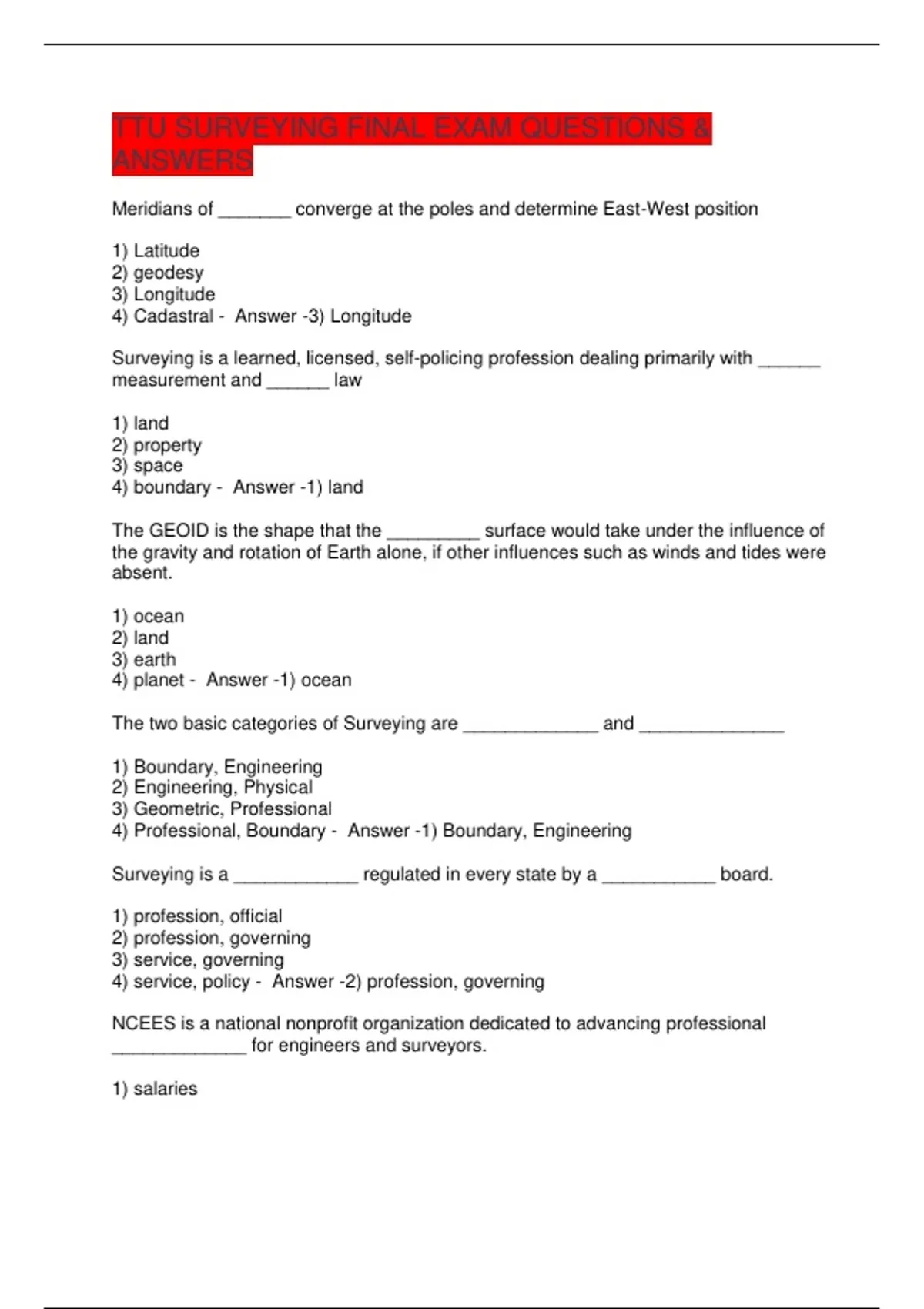 TTU SURVEYING FINAL EXAM QUESTIONS &