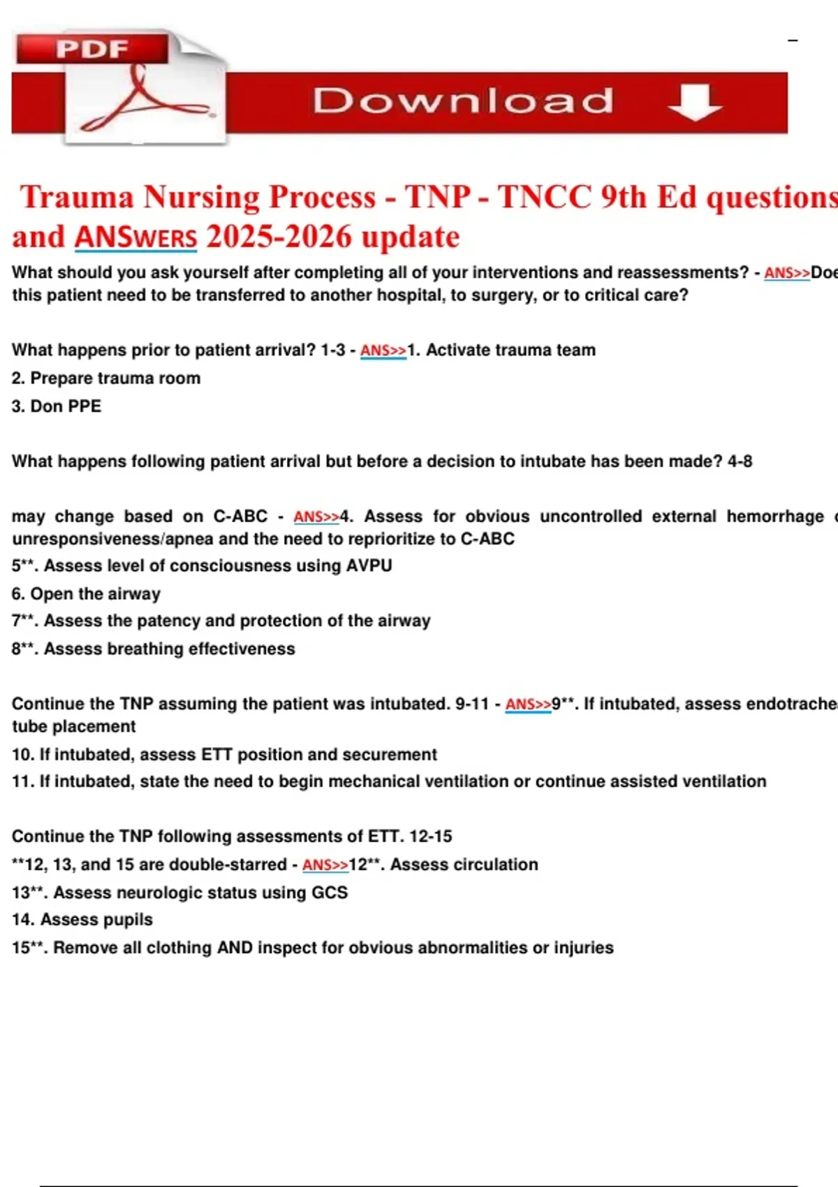 Updated 2025–2026 TNCC 9th Edition Trauma Nursing Process (TNP) study guide with practice questions and verified answers. Designed for emergency nurses, trauma-certified nurses, and nursing students preparing for the Emergency Nurses Association (ENA) Trauma Nursing Core Course (TNCC). Covers trauma assessment, airway, breathing, circulation, neurological status, shock management, and interventions required for safe trauma care.