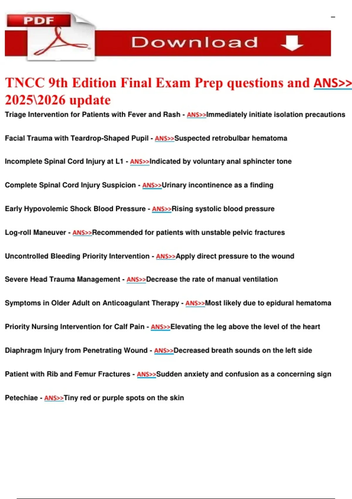TNCC 9th Edition Final Exam Prep questions and ANS>>