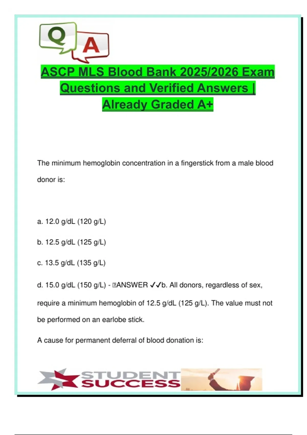 This ASCP Blood Bank Study Guide 2025/2026 is an in-depth, exam-focused resource containing 350+ multiple-choice questions with verified answers and explanations, built specifically for the Medical Laboratory Scientist (MLS) level of the ASCP BOC exam. It comprehensively covers all core and advanced topics in immunohematology, ensuring you're prepared for both routine blood bank procedures and complex serologic problem-solving. The material includes detailed coverage of: ABO/Rh blood grouping and discrepancies Antibody detection and identification including warm, cold, IgM, IgG, and clinically significant antibodies Transfusion reactions: recognition, testing protocols, and response strategies Hemolytic Disease of the Fetus and Newborn (HDFN): prenatal testing, RhIg administration, and fetal monitoring Compatibility testing and crossmatching procedures High-prevalence/low-prevalence antigens and advanced immunohematology panels Molecular testing and genotyping in blood bank practice Donor eligibility, component therapy, storage, and modifications (e.g., leukoreduction, irradiation) Explanations are provided to clarify not only the correct answers, but also why other options are incorrect—ideal for both content mastery and test-taking strategy. This study guide is perfect for: MLS (ASCP) exam candidates focusing on the blood bank section Clinical Laboratory Science and Medical Technology students ASCPi international applicants pursuing certification in immunohematology Laboratory professionals preparing for recertification or CE credits Anyone working in transfusion services, donor centers, or reference immunohematology labs Whether you're learning to interpret antibody panels or preparing for critical decision-making in transfusion reactions, this guide delivers a structured and exam-ready experience. Keywords: ASCP blood bank, immunohematology, antibody ID, ABO Rh typing, transfusion reaction, crossmatch, DAT, IAT, HDFN, RhIg, blood components, antigen phenotyping, weak D testing, elution, reference lab, Coombs test, MLS BOC exam, ASCP MLS 2025, transfusion services, compatibility testing