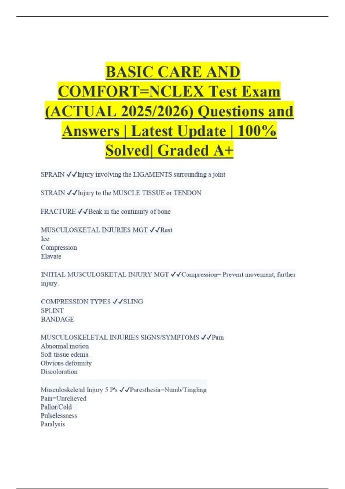 BASIC CARE AND COMFORT=NCLEX Test Exam (ACTUAL 2025/2026) Questions and Answers | Latest Update | 100% Solved| Graded A+ SPRAIN Injury involving the LIGAMENTS surrounding a joint STRAIN Injury to the MUSCLE TISSUE or TENDON FRACTURE Beak in the continuity of bone MUSCULOSKETAL INJURIES MGT Rest Ice Compression Elavate INITIAL MUSCULOSKETAL INJURY MGT Compression= Prevent movement, further injury. COMPRESSION TYPES SLING SPLINT BANDAGE MUSCULOSKELETAL INJURIES SIGNS/SYMPTOMS Pain Abnormal motion Soft tissue edema Obvious deformity Discoloration