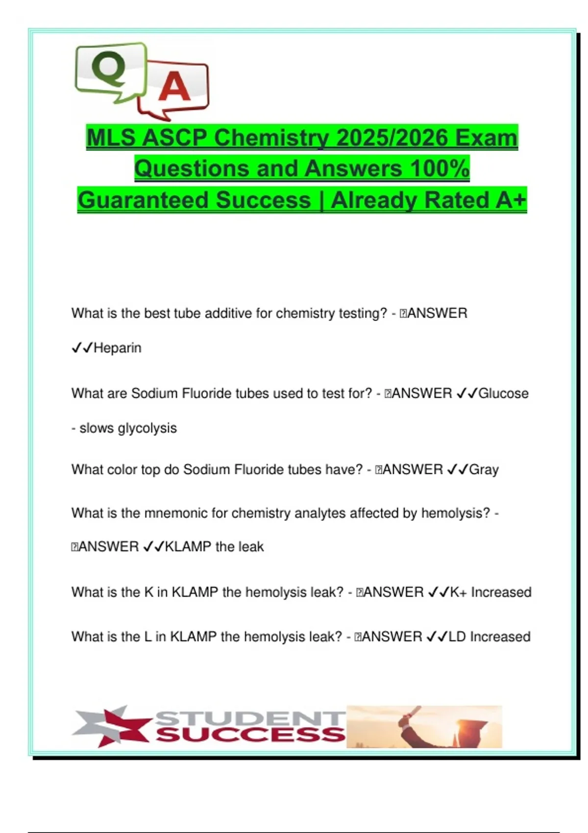 This MLS ASCP Chemistry (2025/2026) exam guide offers 200+ precisely answered questions aligned with the American Society for Clinical Pathology (ASCP) Board of Certification content guidelines. It is meticulously structured for Medical Laboratory Science (MLS/MLT) students, and those preparing for certification or licensure exams in clinical chemistry. Organized for efficient review, this study set covers high-yield content from core lab procedures to advanced biochemical understanding, including analyte behavior, testing methods, quality control, and interpretation. Key topics covered: Specimen Handling & Pre-analytical Variables: Tube additives (heparin, fluoride), hemolysis effects (KLAMP), sample stability Glucose Metabolism & Diabetes Markers: FPG, Hgb A1c, eAG, fructosamine, insulin, glucose oxidase, hexokinase Electrolytes & Osmolality: Sodium, potassium, chloride, bicarbonate, anion gap (w/ and w/o K), osmolality calculations Lipid & Lipoprotein Panels: HDL, LDL, VLDL, Friedewald formula, triglycerides, apolipoproteins Protein Chemistry: Total protein (Biuret, Kjeldahl), electrophoresis patterns, albumin, globulins (α1, α2, β, γ), acute phase reactants Liver Function Tests & Enzymes: ALT, AST, ALP, GGT, 5’NT, ACP, cholinesterase, ABC mnemonic for liver enzyme elevation Pancreatic Enzymes: Amylase, lipase, reference ranges and specificity Renal Function & Clearance Testing: Creatinine (Jaffe), BUN, urinalysis markers, clearance formulas, osmoregulation Acid-Base Balance & ABG Interpretation: Metabolic/respiratory acidosis/alkalosis, compensation, blood gas interpretation Hormones & Endocrine Markers: PTH, vitamin D, calcitonin, insulin, glucose regulatory hormones (GAG CHET) Iron Studies & Anemia Differentials: Ferritin, TIBC, transferrin, iron saturation, HH, ACD, IDA Cardiac Markers: CK isoenzymes, myoglobin, troponins (cTnT, cTnI), BNP Porphyrin Testing & Special Assays: Watson-Schwartz, xylose, procalcitonin, hormone clearance methods Ideal for: MLS, MLT, and Clinical Chemistry students ASCP BOC candidates (MLS/MLT Chemistry focus) Pathology residents, Lab techs, and Biomedical Science majors Students preparing for NCLEX, NCA, or international lab science boards Formatted with quick recall mnemonics (e.g., KLAMP, GAG CHET, ABC) and calculation formulas (e.g., Friedewald, Anion Gap, Creatinine Clearance) to make studying faster and more practical. Keywords: ASCP chemistry, MLS exam, MLT review, heparin tube, KLAMP mnemonic, glucose oxidase, Hgb A1c, eAG formula, insulin, electrolytes, sodium, potassium, chloride, anion gap, osmolality, lipids, HDL, LDL, triglycerides, albumin, globulins, liver enzymes, ALT, AST, GGT, pancreatic enzymes, creatinine clearance, BUN, metabolic acidosis, respiratory alkalosis, vitamin D, PTH, ferritin, TIBC, troponin, BNP, porphobilinogen, Jaffe reaction