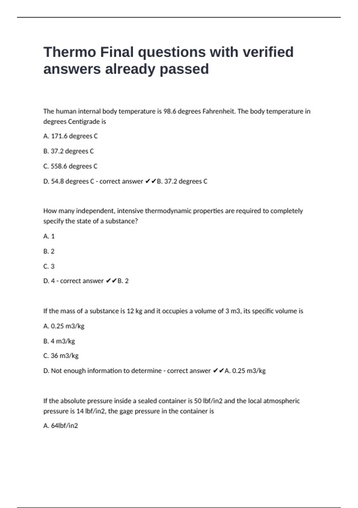Thermo Final questions with verified answers already passed The human internal body temperature is 98.6 degrees Fahrenheit. The body temperature in degrees Centigrade is A. 171.6 degrees C B. 37.2 degrees C C. 558.6 degrees C D. 54.8 degrees C - correct answer B. 37.2 degrees C How many independent, intensive thermodynamic properties are required to completely specify the state of a substance? A. 1 B. 2 C. 3 D. 4 - correct answer B. 2 If the mass of a substance is 12 kg and it occupies a volume of 3 m3, its specific volume is A. 0.25 m3/kg B. 4 m3/kg C. 36 m3/kg D. Not enough information to determine - correct answer A. 0.25 m3/kg If the absolute pressure inside a sealed container is 50 lbf/in2 and the local atmospheric pressure is 14 lbf/in2, the gage pressure in the container is