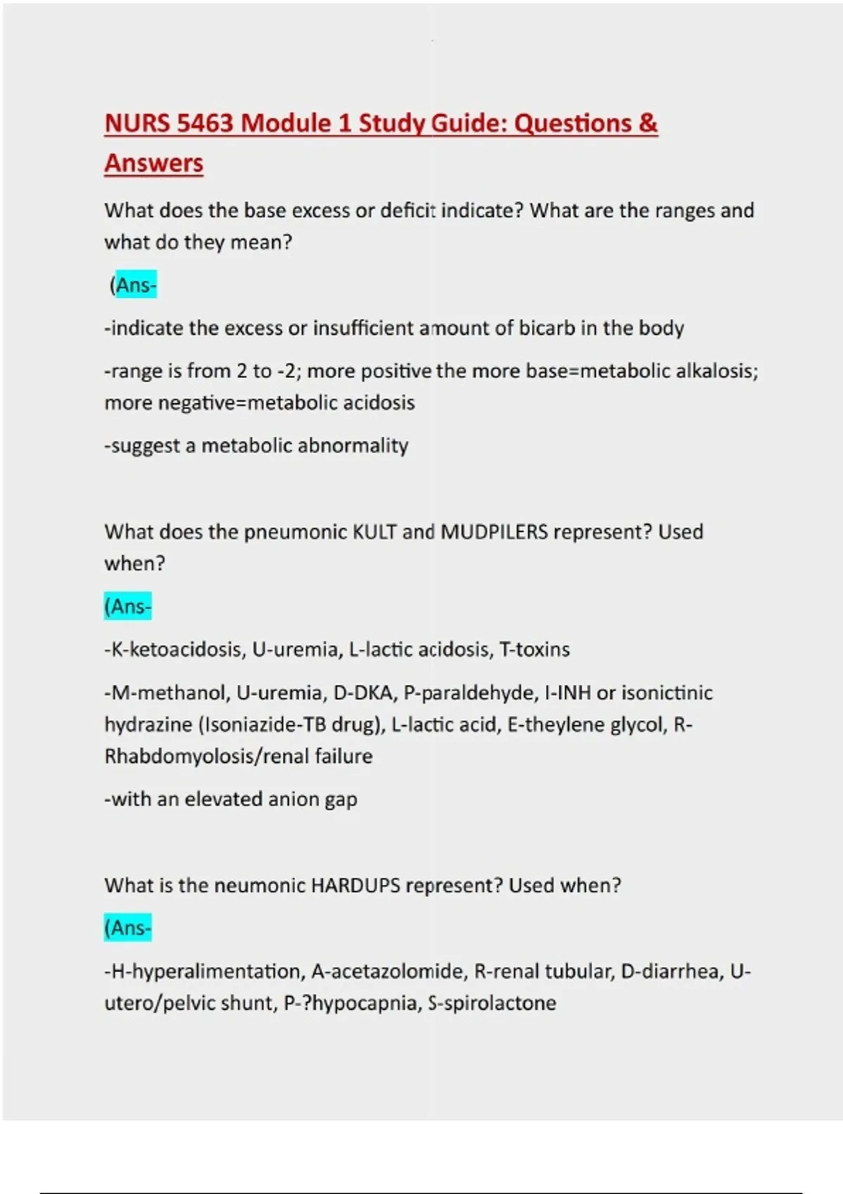 What does the base excess or deficit indicate? What are the ranges and what do they mean? (Ans- -indicate the excess or insufficient amount of bicarb in the body -range is from 2 to -2; more positive the more base=metabolic alkalosis; more negative=metabolic acidosis -suggest a metabolic abnormality What does the pneumonic KULT and MUDPILERS represent? Used when? (Ans- -K-ketoacidosis, U-uremia, L-lactic acidosis, T-toxins -M-methanol, U-uremia, D-DKA, P-paraldehyde, I-INH or isonictinic hydrazine (Isoniazide-TB drug), L-lactic acid, E-theylene glycol, RRhabdomyolosis/renal failure -with an elevated anion gap What is the neumonic HARDUPS represent? Used when? (Ans- -H-hyperalimentation, A-acetazolomide, R-renal tubular, D-diarrhea, Uutero/pelvic shunt, P-?hypocapnia, S-spirolactoneExplain the delta ratio, normal ranges, and what the ranges mean. (Ans- -it assess simultaneous acid-base disorders -normal range is 1-2 (pure metabolic acidosis) -Less than 1 means that there is a combined high anion gap metabolic acidosis and a normal metabolic acidosis -Greater than 2 means there is a high anion gap metabolic acidosis with a concurrent metabolic alkalosis. How do you calculate the delta-ratio?
