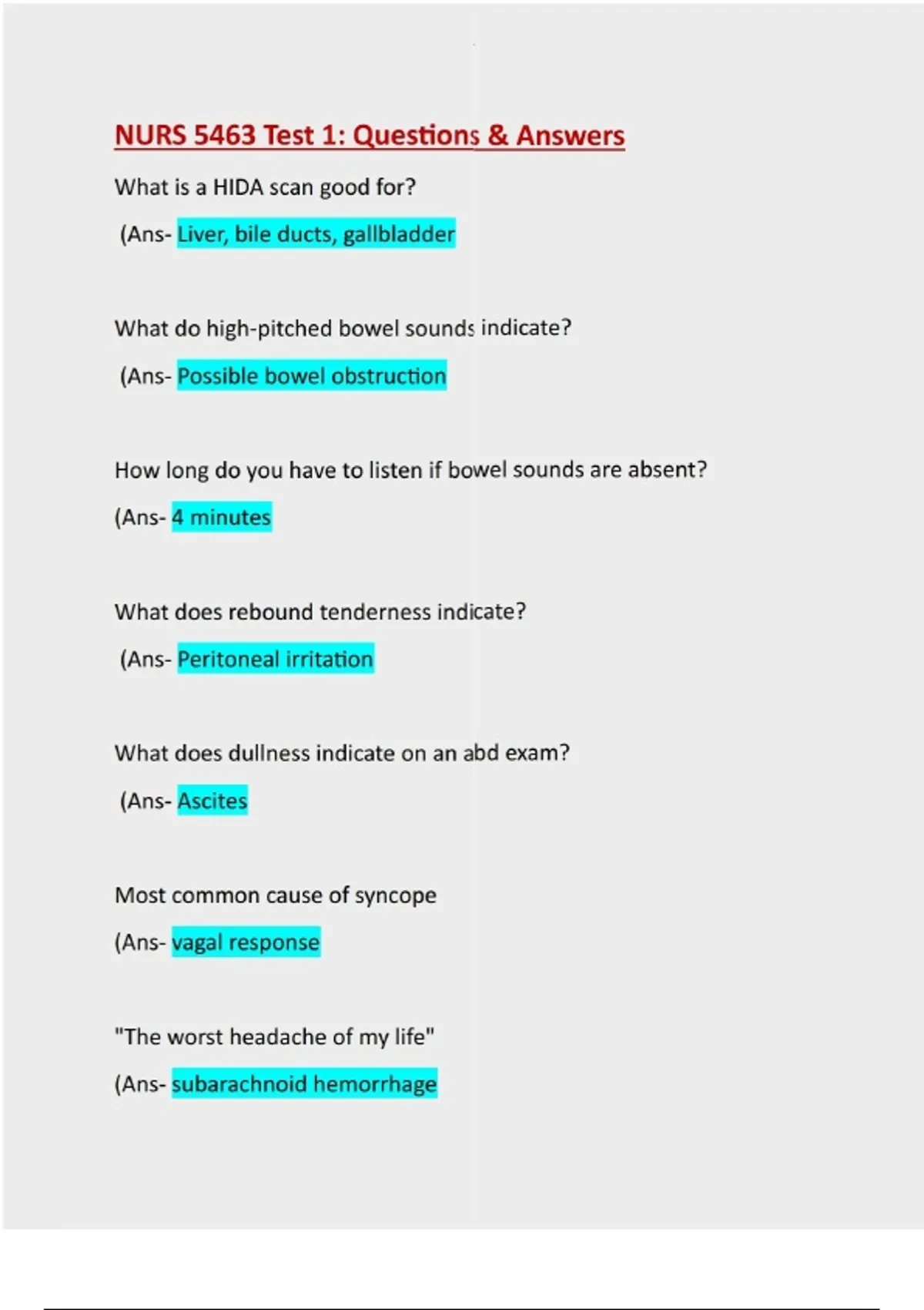 What is a HIDA scan good for? (Ans- Liver, bile ducts, gallbladder What do high-pitched bowel sounds indicate? (Ans- Possible bowel obstruction How long do you have to listen if bowel sounds are absent? (Ans- 4 minutes What does rebound tenderness indicate? (Ans- Peritoneal irritation What does dullness indicate on an abd exam? (Ans- Ascites Most common cause of syncope (Ans- vagal response "The worst headache of my life" (Ans- subarachnoid hemorrhageWork-up if presenting with HA and known hx of HA? (Ans- No w/u needed unless new/worsening s/s What labs do you need for HA with scalp tenderness or suspected arteritis? (Ans- ESR or CRP Labs for suspected vasculitis (Ans- ANA, ANCA Onset of migraines after age 50 need (Ans- MRI brain primary team goes off duty and on-call team comes on Ans- shift change