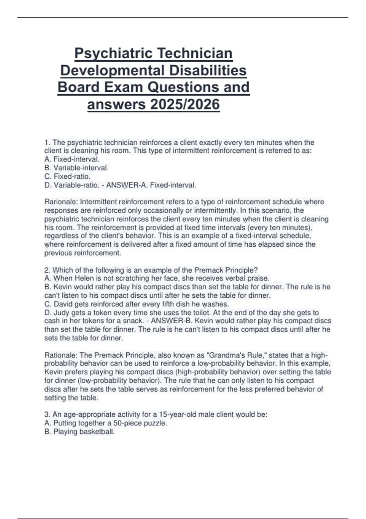 Psychiatric Technician Developmental Disabilities Board Exam Questions and answers 2025/2026