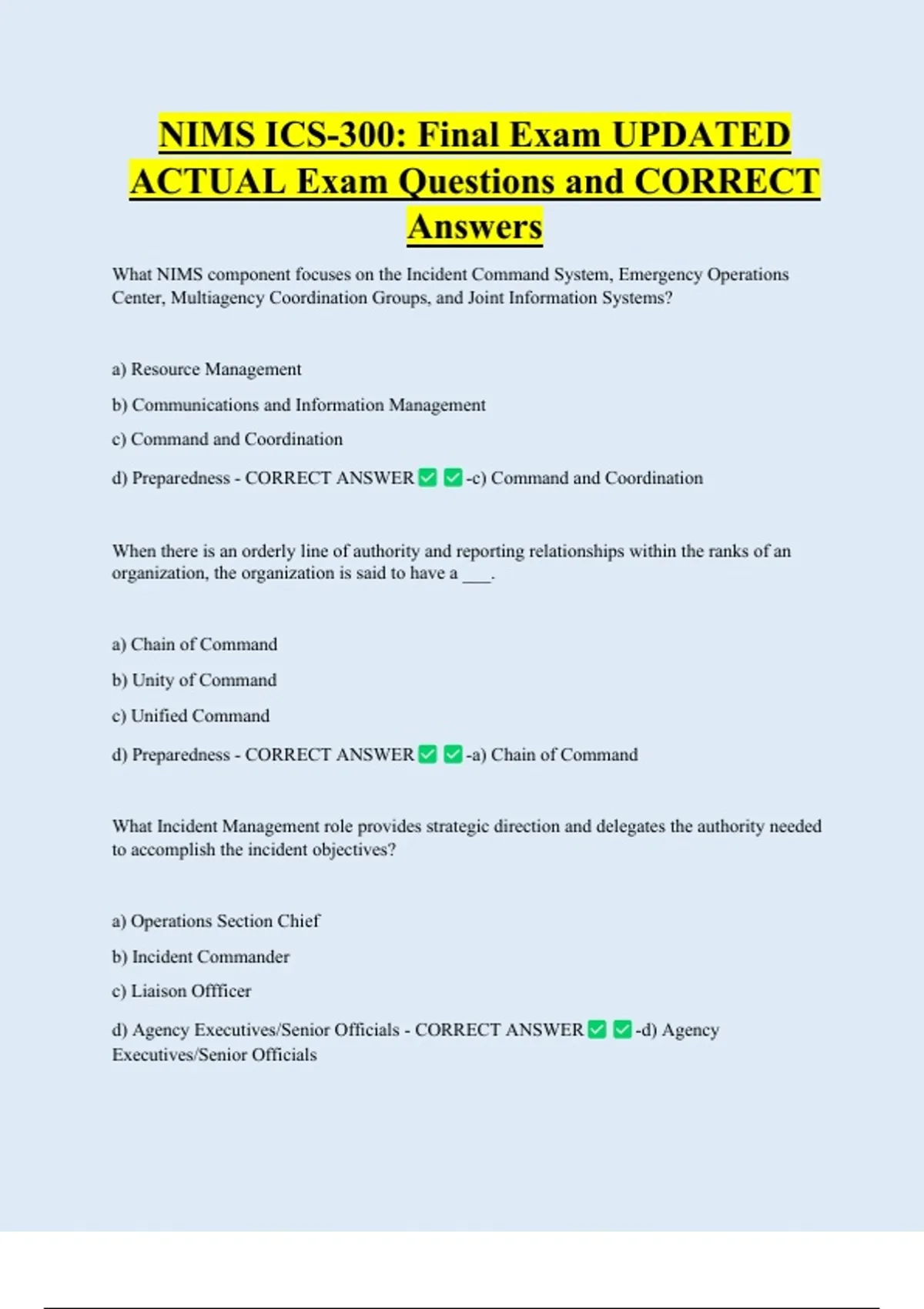 NIMS ICS-300: Final Exam UPDATED ACTUAL Exam Questions and CORRECT Answers What NIMS component focuses on the Incident Command System, Emergency Operations Center, Multiagency Coordination Groups, and Joint Information Systems? a) Resource Management b) Communications and Information Management c) Command and Coordination d) Preparedness - CORRECT ANSWER -c) Command and Coordination
