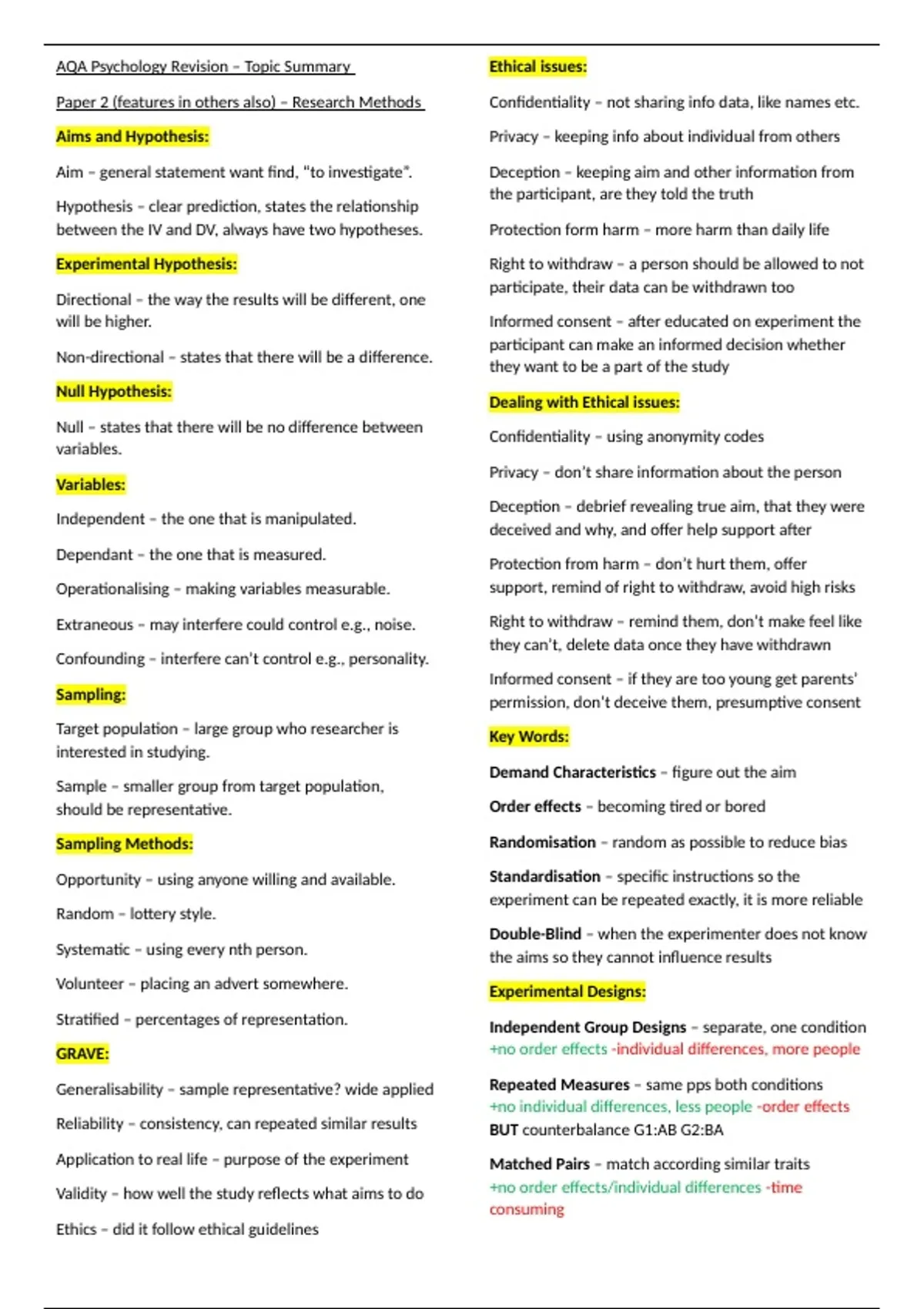 Explanation of resource: - AQA A-level Psychology summary of research methods, mainly features in paper 2 but spread across all 3 - Information collated from AQA A-level Psychology textbook and Up learn - Topic summary designed for refreshing prior knowledge - Helped me to achieve A* predictions and mock exam grades - Details of resource: Date resource created: 1st January 2024 Creator: Holly Alexandra Kitching Qualification level: A-level Subject: Psychology Exam Board: AQA - Key: Green text: Positive evaluation points of explanations or studies Red text: Negative evaluation points of explanations or studies