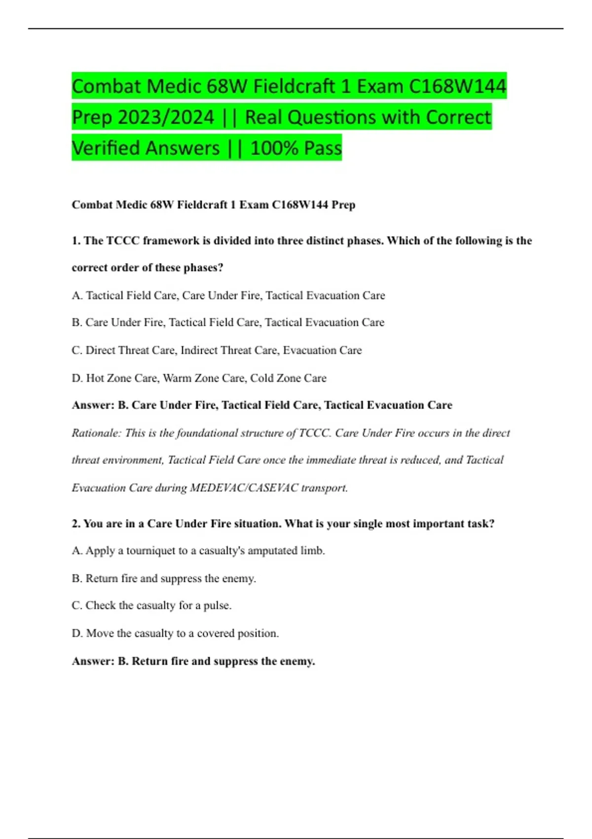 Combat Medic 68W Fieldcraft 1 Exam C168W144 Prep 2023/2024 || Real Questions with Correct Verified Answers || 100% Pass Combat Medic 68W Fieldcraft 1 Exam C168W144 Prep 1. The TCCC framework is divided into three distinct phases. Which of the following is the correct order of these phases? A. Tactical Field Care, Care Under Fire, Tactical Evacuation Care B. Care Under Fire, Tactical Field Care, Tactical Evacuation Care C. Direct Threat Care, Indirect Threat Care, Evacuation Care D. Hot Zone Care, Warm Zone Care, Cold Zone Care Answer: B. Care Under Fire, Tactical Field Care, Tactical Evacuation Care Rationale: This is the foundational structure of TCCC. Care Under Fire occurs in the direct threat environment, Tactical Field Care once the immediate threat is reduced, and Tactical Evacuation Care during MEDEVAC/CASEVAC transport. 2. You are in a Care Under Fire situation. What is your single most important task? A. Apply a tourniquet to a casualty's amputated limb. B. Return fire and suppress the enemy. C. Check the casualty for a pulse. D. Move the casualty to a covered position. Answer: B. Return fire and suppress the enemy. Rationale: In Care Under Fire, the mission is to win the firefight. The greatest medicine is fire superiority. Providing care while still under direct threat can result in more casualties. 3. During Tactical Field Care, you are assessing a casualty using the MARCH algorithm. What does the acronym "MARCH" stand for? A. Massive Hemorrhage, Airway, Respiration, Circulation, Head/Hypothermia B. Major Bleeding, Airway, Breathing, CPR, Hypovolemia C. Movement, Airway, Respiration, Circulation, Hemorrhage D. Massive Bleeding, Aspiration, Respiratory, Cardiac, Heat Answer: A. Massive Hemorrhage, Airway, Respiration, Circulation, Head/Hypothermia Rationale: MARCH is the systematic assessment and treatment sequence for Tactical Field Care. It prioritizes the most immediately life-threatening conditions first.