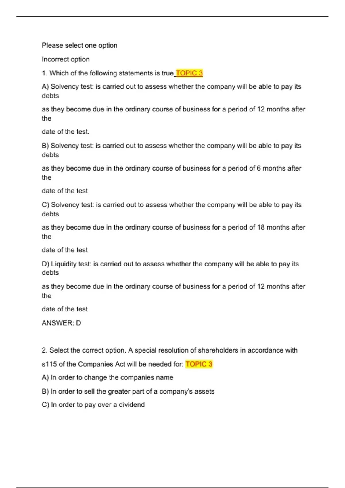 2. Select the correct option. A special resolution of shareholders in accordance with