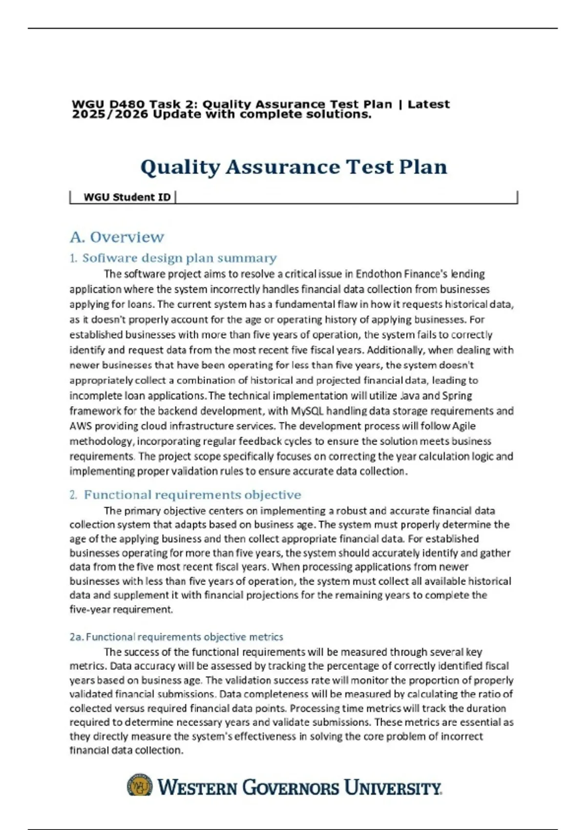 WGU D480 Task 2: Quality Assurance Test Plan | Latest 2025/2026 Update with complete solutions.