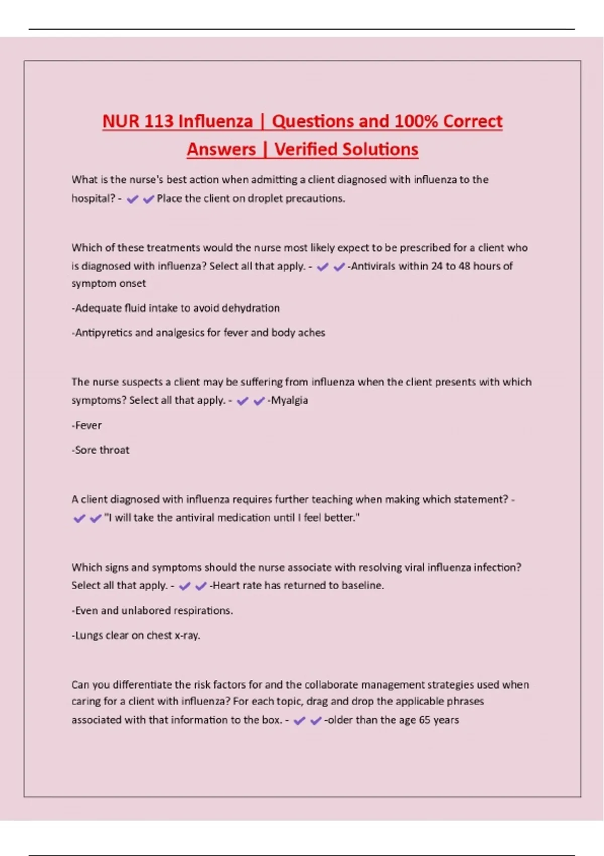NUR 113 Influenza | Questions and 100% Correct Answers | Verified Solutions