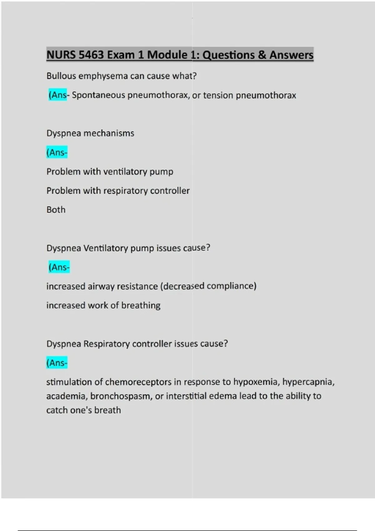 Bullous emphysema can cause what? (Ans- Spontaneous pneumothorax, or tension pneumothorax Dyspnea mechanisms (AnsProblem with ventilatory pump Problem with respiratory controller Both Dyspnea Ventilatory pump issues cause? (Ansincreased airway resistance (decreased compliance) increased work of breathing Dyspnea Respiratory controller issues cause? (Ansstimulation of chemoreceptors in response to hypoxemia, hypercapnia, academia, bronchospasm, or interstitial edema lead to the ability to catch one's breathDyspnea HPI questions to ask (AnsDescription of dyspnea (quality of breathing) Functional impact of dyspnea Timing - when did it start? Precipitating factors - smoke exposure? Associated factors - fever, CP, cough, rash, N/V, etc. Dyspnea risk factors (Ansimmobility recent surgery age smoking - former or current malignancy autoimmune diseases recent upper respiratory infectionPMH to ask about for dyspnea? (Ansmalignancy chronic respiratory disorders (Asthma, COPD, interstitial lung disease) Heart Failure Chronic liver disease (volume overload) CKD Social history to ask about for dyspnea? (Anscurrent/former smoker illicit drug use chronic alcohol abuse Dyspnea assessment (AnsHandle emergent signs first physical exam - visual assessment - accessory muscle use, sitting position, pursed-lip breathing, cyanosis, rate Vitals - tachy, elevated BP, tachypnea, hypoxemiaFocused assessment for dyspnea? (AnsPulmonary-clubbing, edema, cyanosis, rashes, joint deformities Cardiac Both visual and auscultation Respiratory causes of dyspnea (AnsCOPD/asthma ILD/IPF pneumothorax neuromuscular disorders - GB or MG