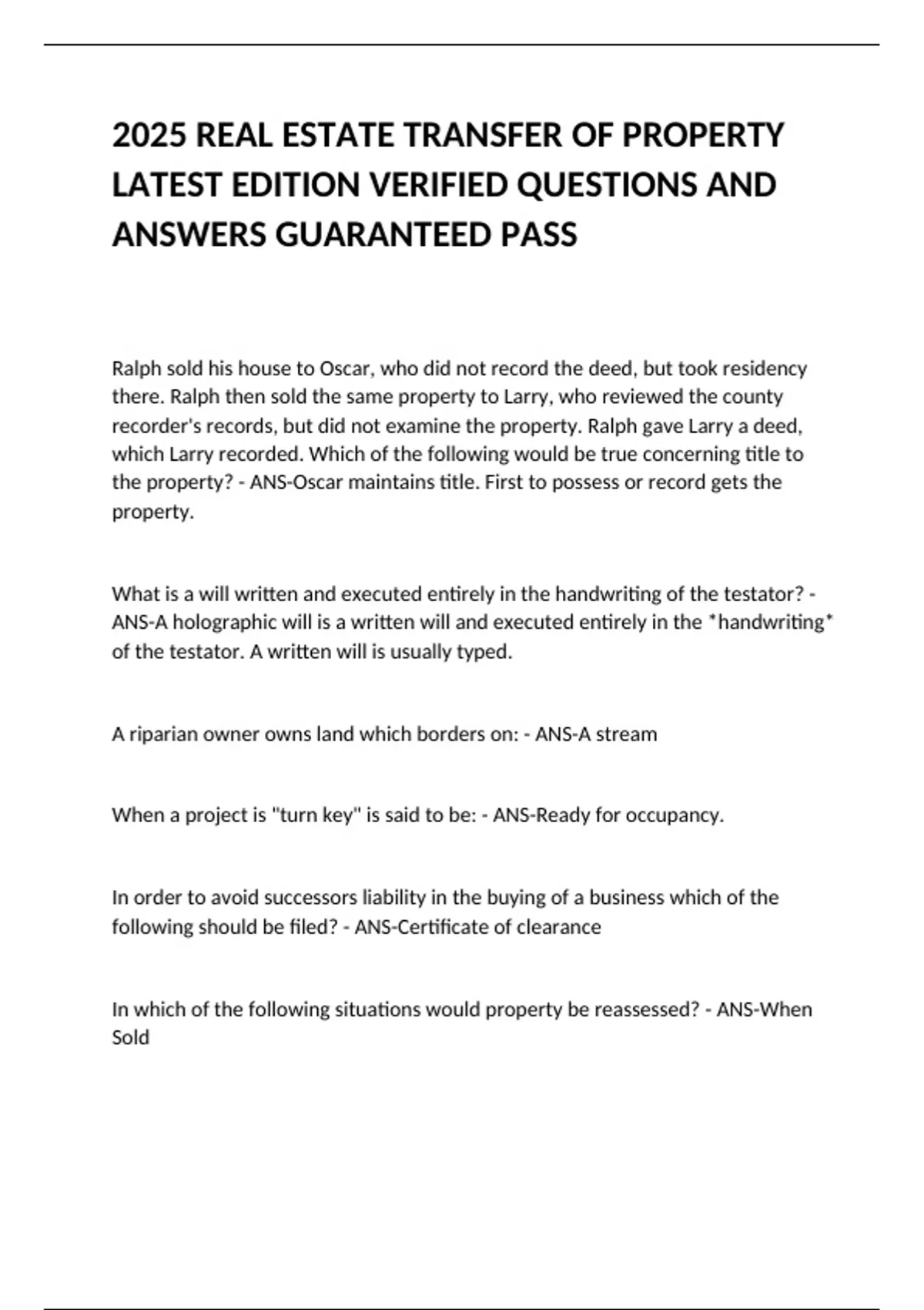 2025 REAL ESTATE TRANSFER OF PROPERTY LATEST EDITION VERIFIED QUESTIONS AND ANSWERS GUARANTEED PASS