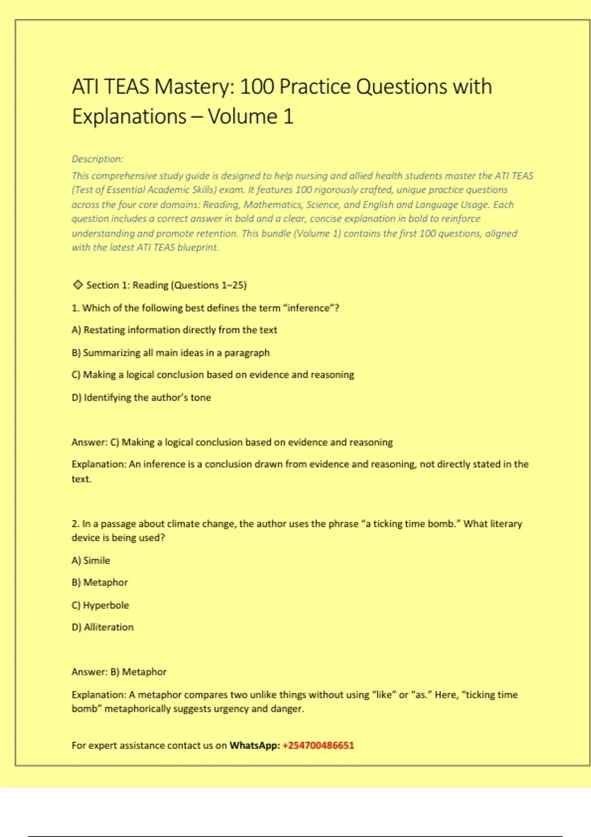 This comprehensive study guide is designed to help nursing and allied health students master the ATI TEAS (Test of Essential Academic Skills) exam. It features 100 rigorously crafted, unique practice questions across the four core domains: Reading, Mathematics, Science, and English and Language Usage. Each question includes a correct answer in bold and a clear, concise explanation in bold to reinforce understanding and promote retention. This bundle (Volume 1) contains the first 100 questions, aligned with the latest ATI TEAS blueprint.