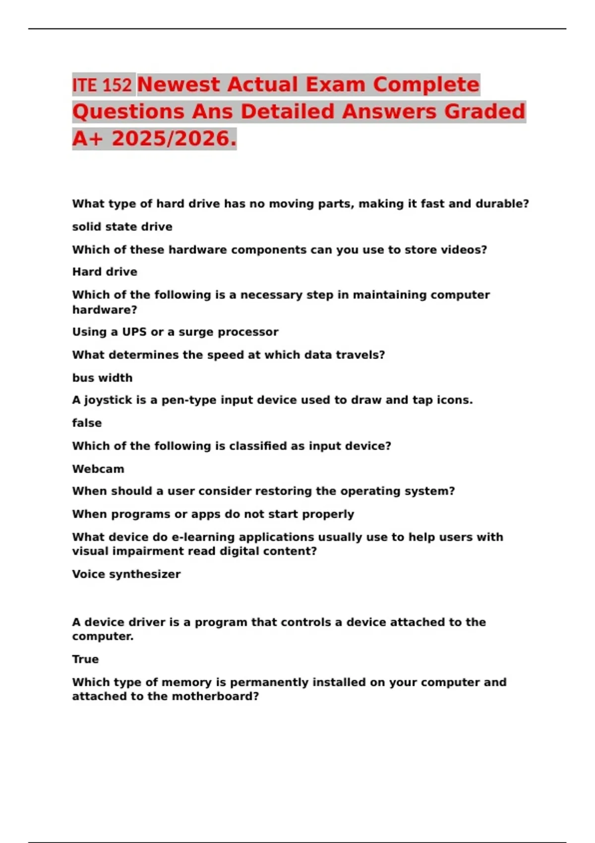 ITE 152 Newest Actual Exam Complete Questions Ans Detailed Answers Graded A+ 2025/2026.