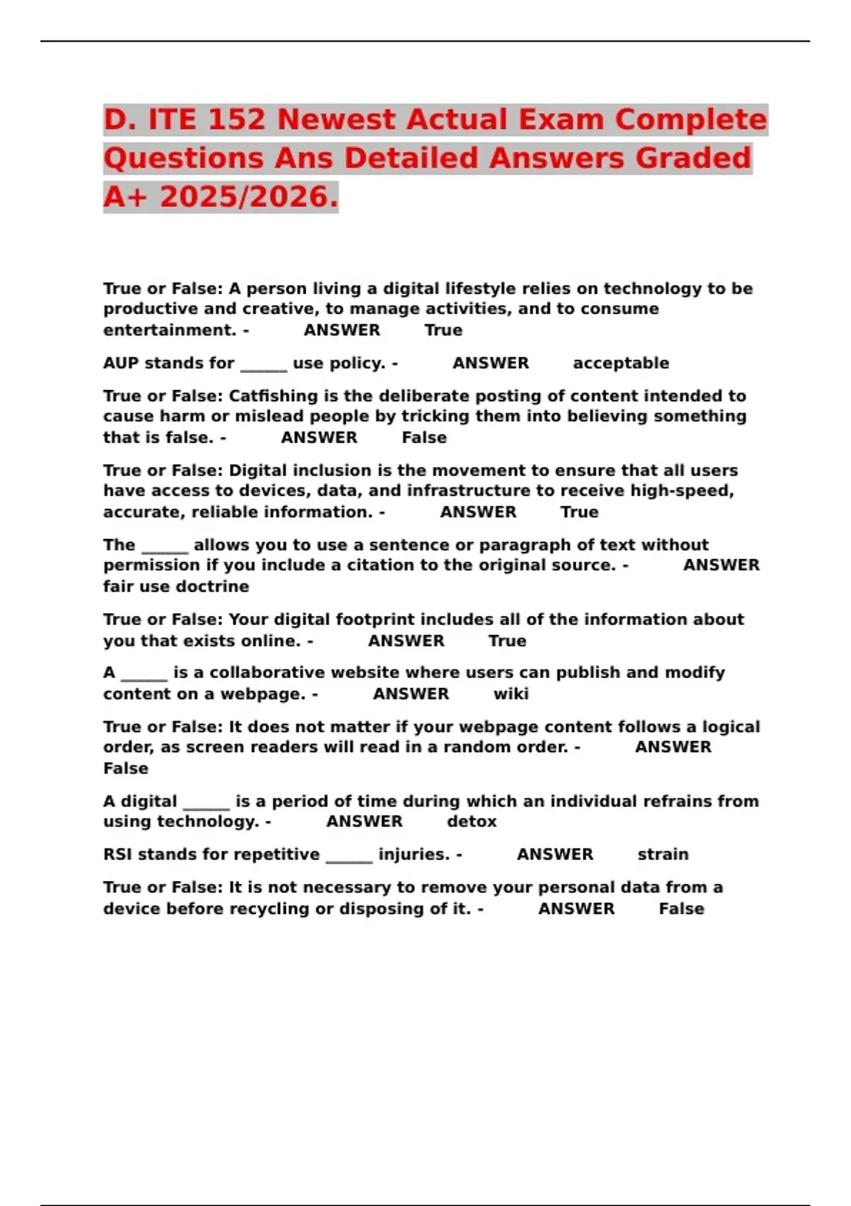 D. ITE 152 Newest Actual Exam Complete