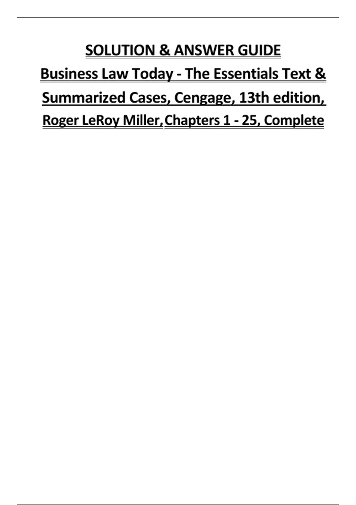 Master your business law course with this complete Solution & Answer Guide for Business Law Today – The Essentials Text & Summarized Cases, 13th Edition by Roger LeRoy Miller (Cengage). Covers all 25 chapters with detailed solutions to exercises, case questions, and end-of-chapter problems. Topics include contracts, torts, criminal law, business organizations, property, agency, employment law, and government regulation. Ideal for business students, law students, and instructors preparing for exams or assignments. Updated for 2024/2025 academic year, professionally organized, and rated A+ quality for guaranteed exam success.