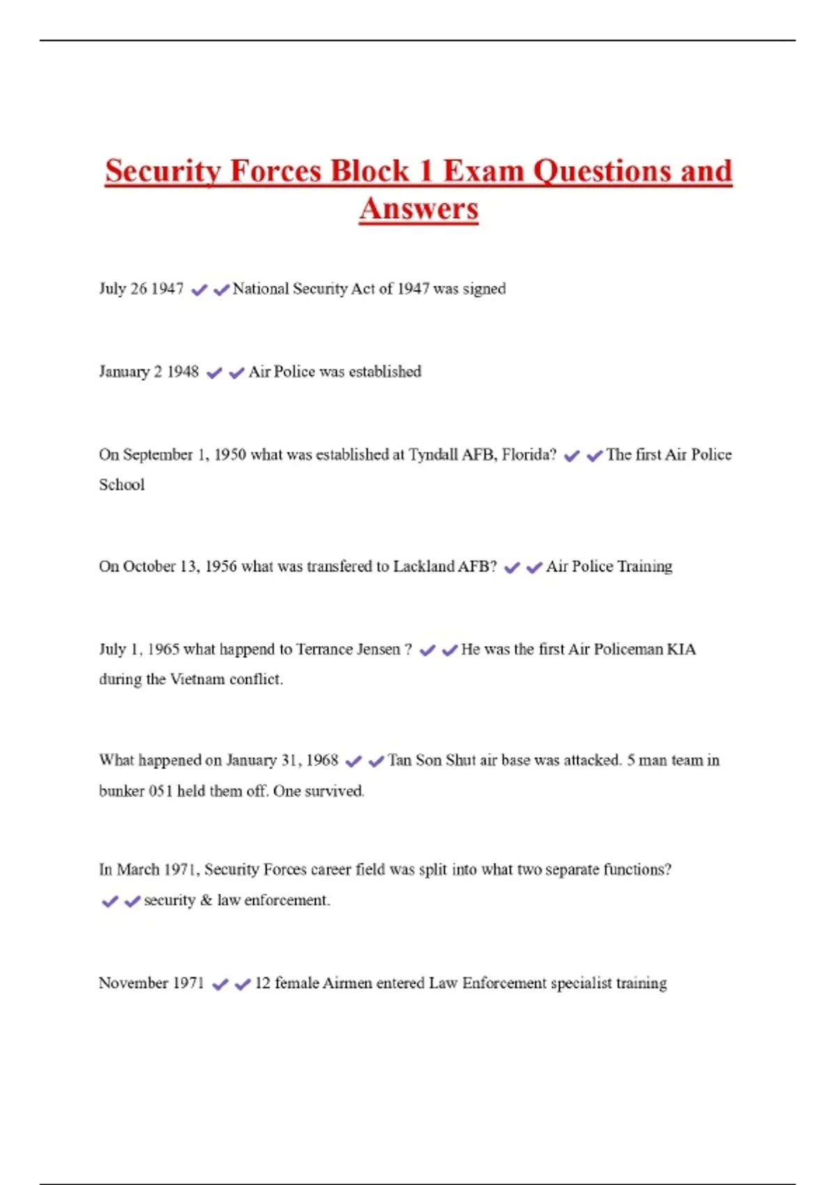 Security Forces Block 1 Exam Questions and Answers July 26 1947 January 2 1948 National Security Act of 1947 was signed Air Police was established On September 1, 1950 what was established at Tyndall AFB, Florida? School On October 13, 1956 what was transfered to Lackland AFB? July 1, 1965 what happend to Terrance Jensen ? The first Air Police Air Police Training He was the first Air Policeman KIA during the Vietnam conflict.