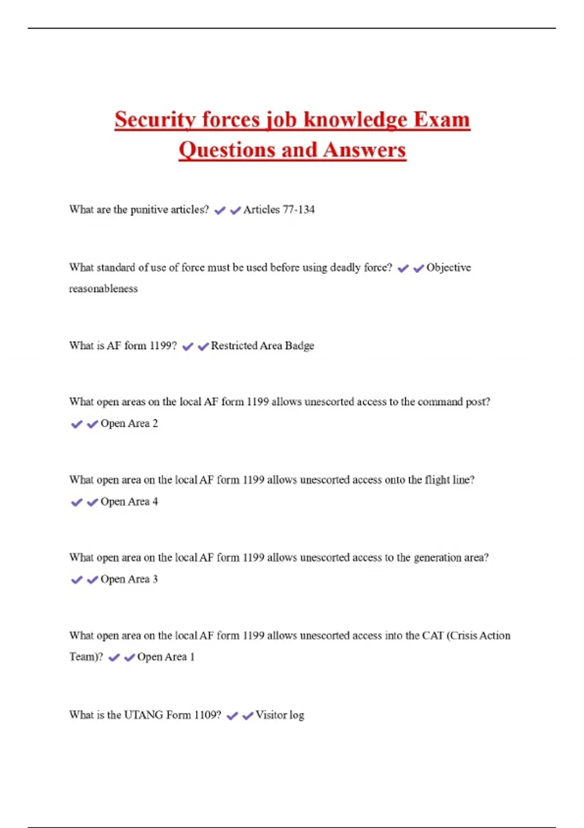 Security forces job knowledge Exam Questions and Answers What are the punitive articles? Articles 77-134 What standard of use of force must be used before using deadly force? reasonableness What is AF form 1199? Restricted Area Badge Objective What open areas on the local AF form 1199 allows unescorted access to the command post? Open Area 2 What open area on the local AF form 1199 allows unescorted access onto the flight line? Open Area 4