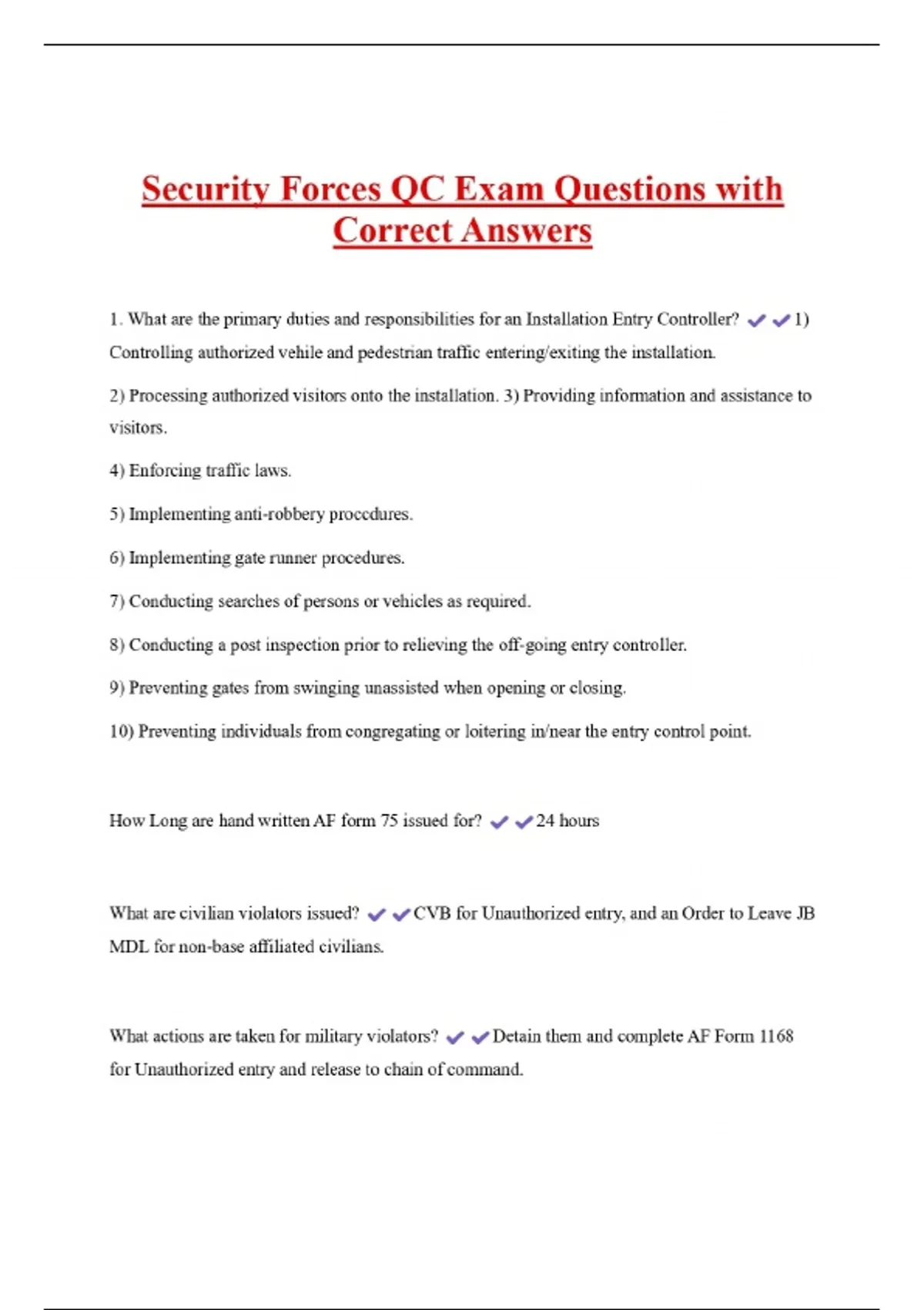 Security Forces QC Exam Questions with Correct Answers 1. What are the primary duties and responsibilities for an Installation Entry Controller? Controlling authorized vehile and pedestrian traffic entering/exiting the installation. 1) 2) Processing authorized visitors onto the installation. 3) Providing information and assistance to visitors. 4) Enforcing traffic laws. 5) Implementing anti-robbery proccdures. 6) Implementing gate runner procedures. 7) Conducting searches of persons or vehicles as required. 8) Conducting a post inspection prior to relieving the off-going entry controller. 9) Preventing gates from swinging unassisted when opening or closing. 10) Preventing individuals from congregating or loitering in/near the entry control point. How Long are hand written AF form 75 issued for? What are civilian violators issued? 24 hours