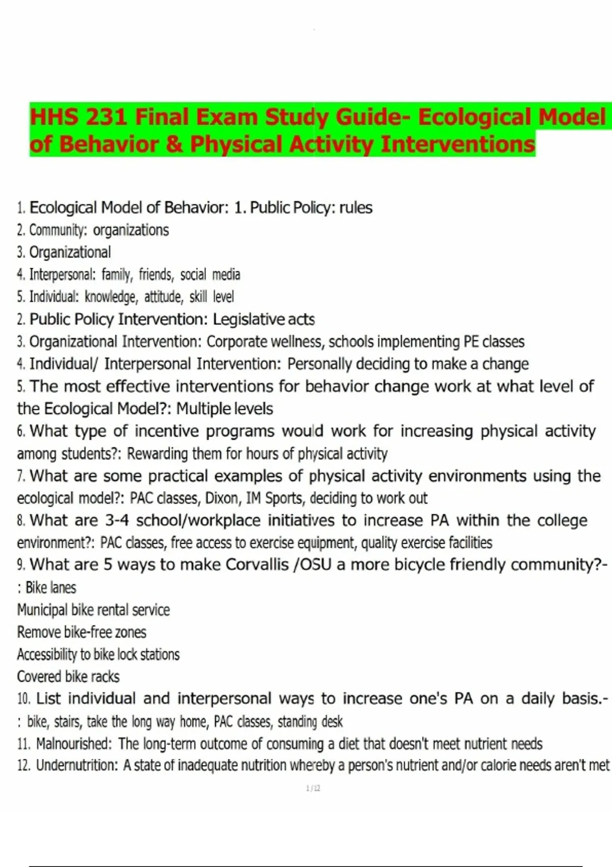 HHS 231 Final Exam Study Guide- Ecological Model of Behavior & Physical Activity Interventions.pdf