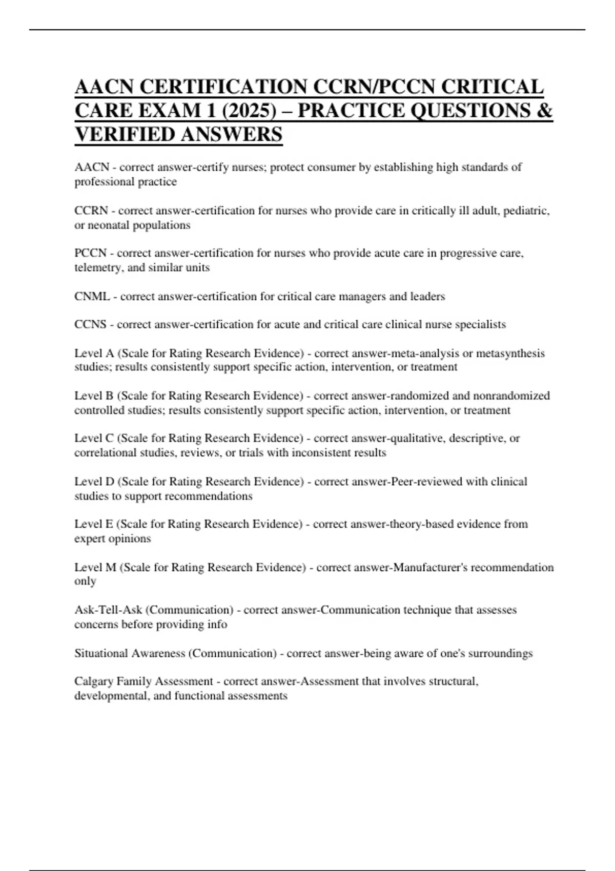 CCRN/PCCN Certification Exam | AACN Critical Care Exam 1 (Part 1) | 2025 Practice Test Prepare with confidence for the AACN CCRN/PCCN Certification Exam using this Critical Care Exam 1 (Part 1) practice test. This resource is designed to help nurses strengthen their knowledge in adult, pediatric, and progressive care nursing concepts, including patient management, clinical judgment, and professional caring practices. Perfect for those getting ready for the 2025 CCRN or PCCN exams, this study guide provides verified practice questions with detailed solutions to boost your readiness and test-taking skills.