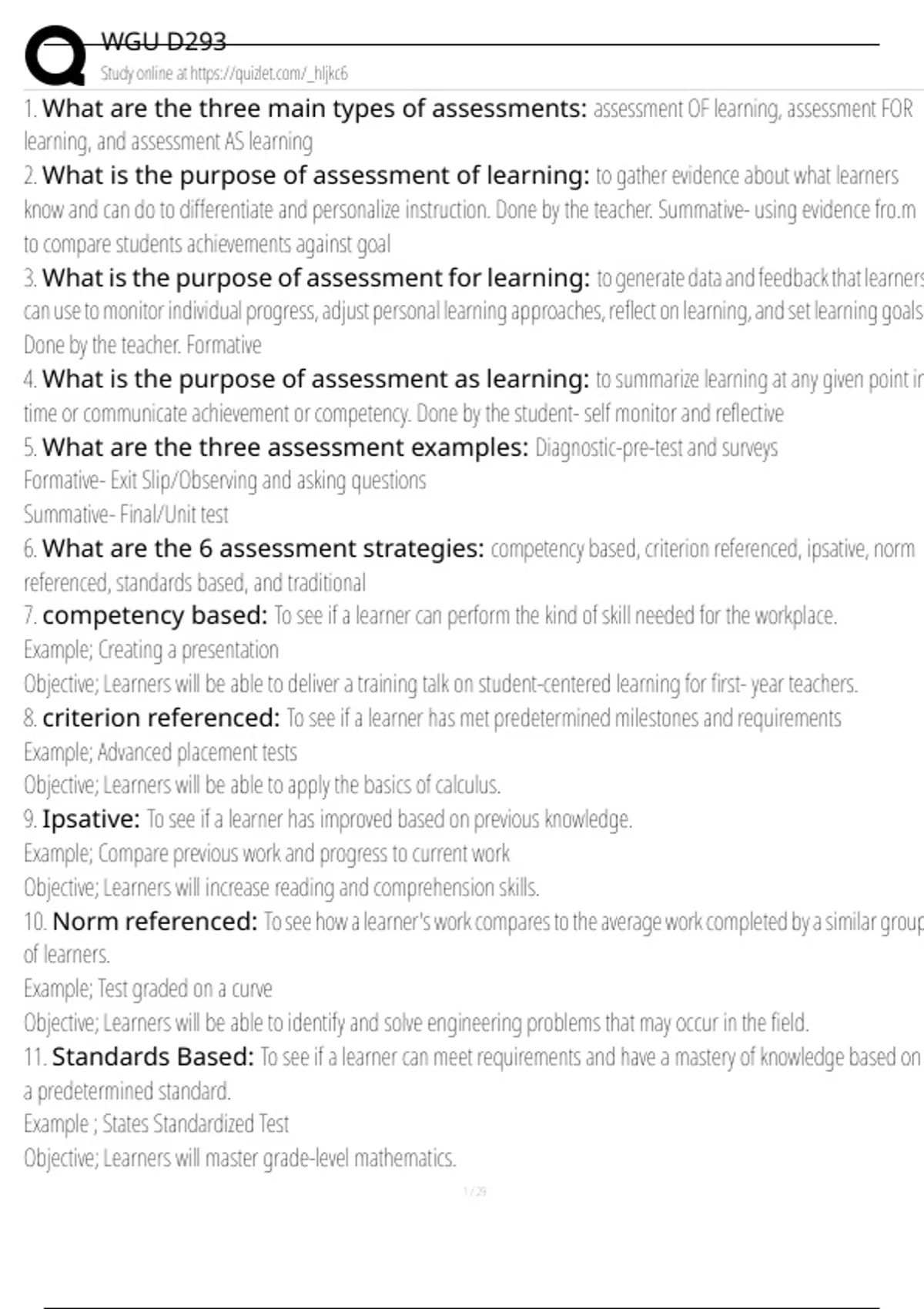 1. What are the three main types of assessments: assessment OF learning, assessment FOR