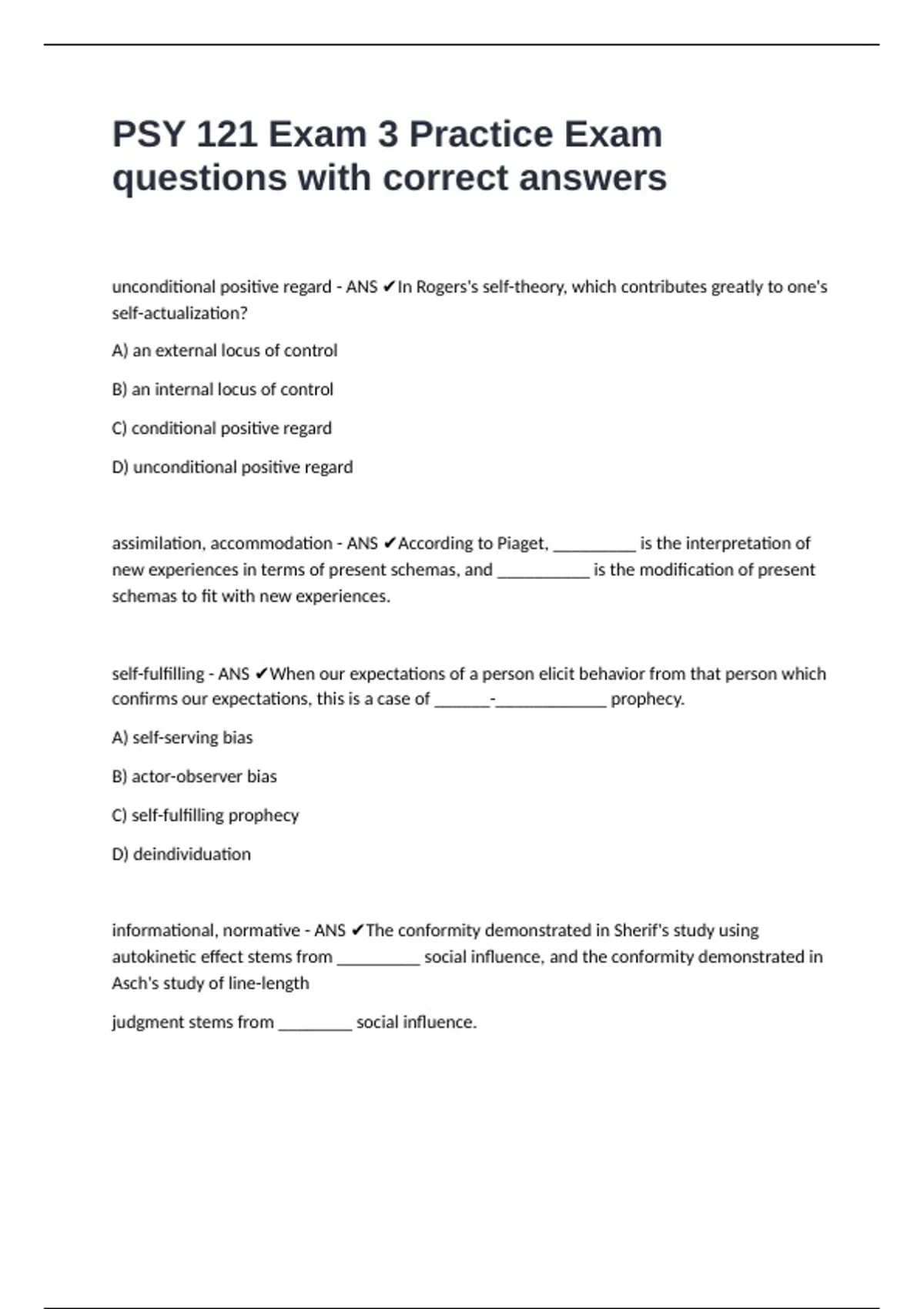 PSY 121 Exam 3 Practice Exam questions with correct answers