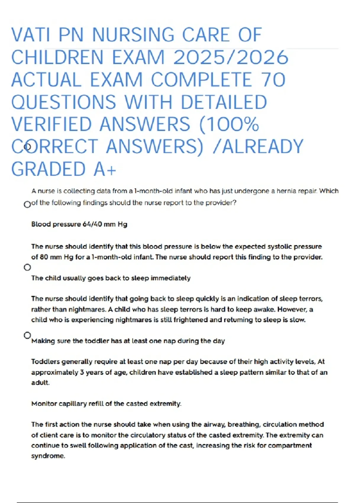 I only offer qualified and verified PN VATI NURSING CARE OF CHILDREN 2019 FORM A,B & C /VATI PN NURSING CARE OF CHILDREN REAL EXAM QUESTIONS AND CORRECT ANSWERS