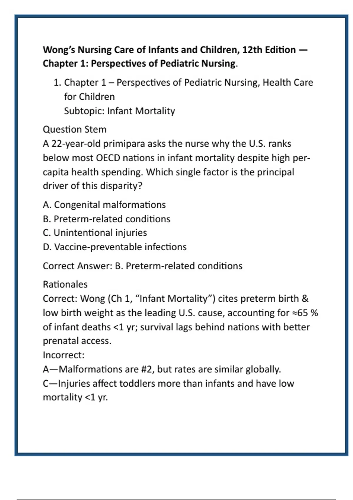 Correct: Wong (Ch 1, “Infant Mortality”) cites preterm birth &
