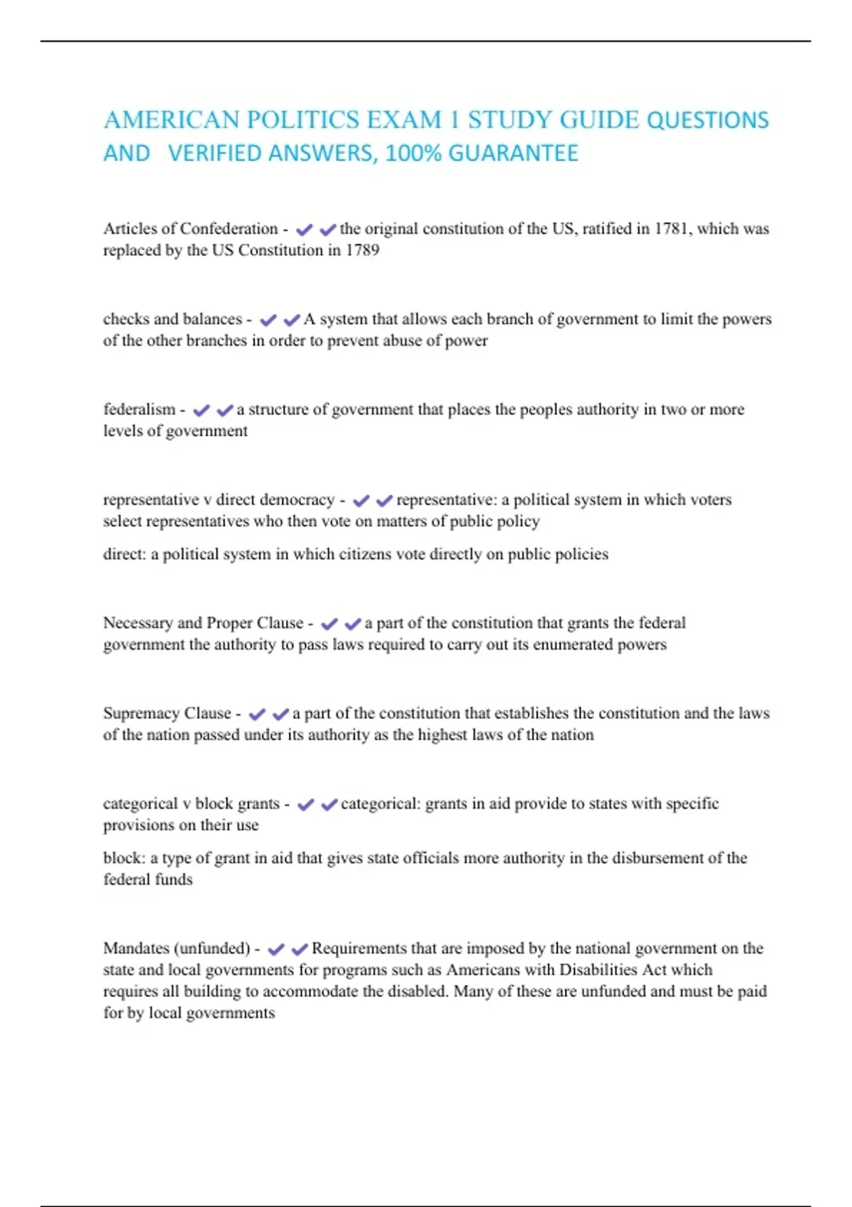 AMERICAN POLITICS EXAM 1 STUDY GUIDE QUESTIONS