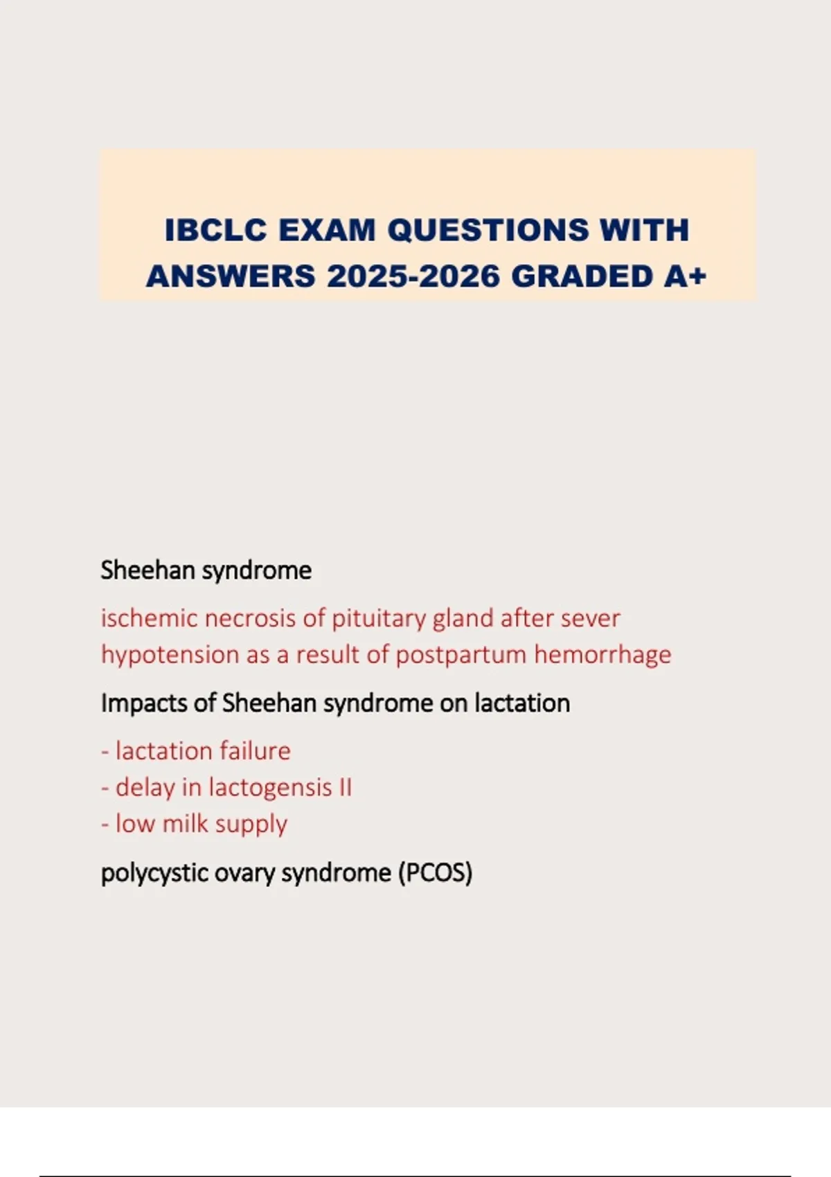 IBCLC EXAM QUESTIONS WITH ANSWERS GRADED A+ Sheehan syndrome ischemic necrosis of pituitary gland after sever hypotension as a result of postpartum hemorrhage Impacts of Sheehan syndrome on lactation - lactation failure - delay in lactogensis II - low milk supply polycystic ovary syndrome (PCOS) Endocrine disorder causing high levels of androgens (predominantly male hormones) in women along with polycystic ovaries Impacts of PCOS on lactation