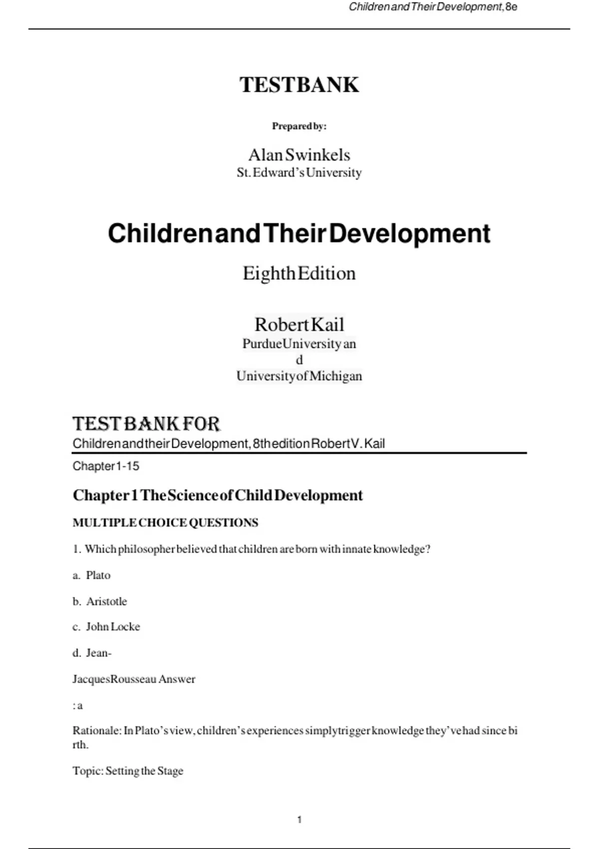 TEST BANK FOR Children and Their Development Kindle Edition by Robert Kail COMPLETE GUIDE WITH RATIONALES 100% VERIFIED A+ GRADE ASSURED!!!!NEW LATEST UPDATE!!!!!!