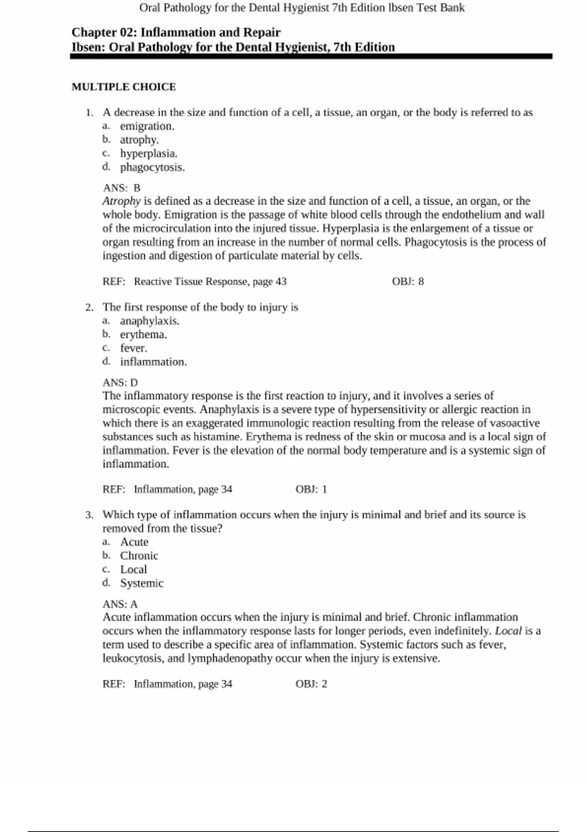 Test Bank For Oral Pathology for the Dental Hygienist 7th Edition by Olga A. C. Ibsen (Chapter 02: Inflammation and Repair)