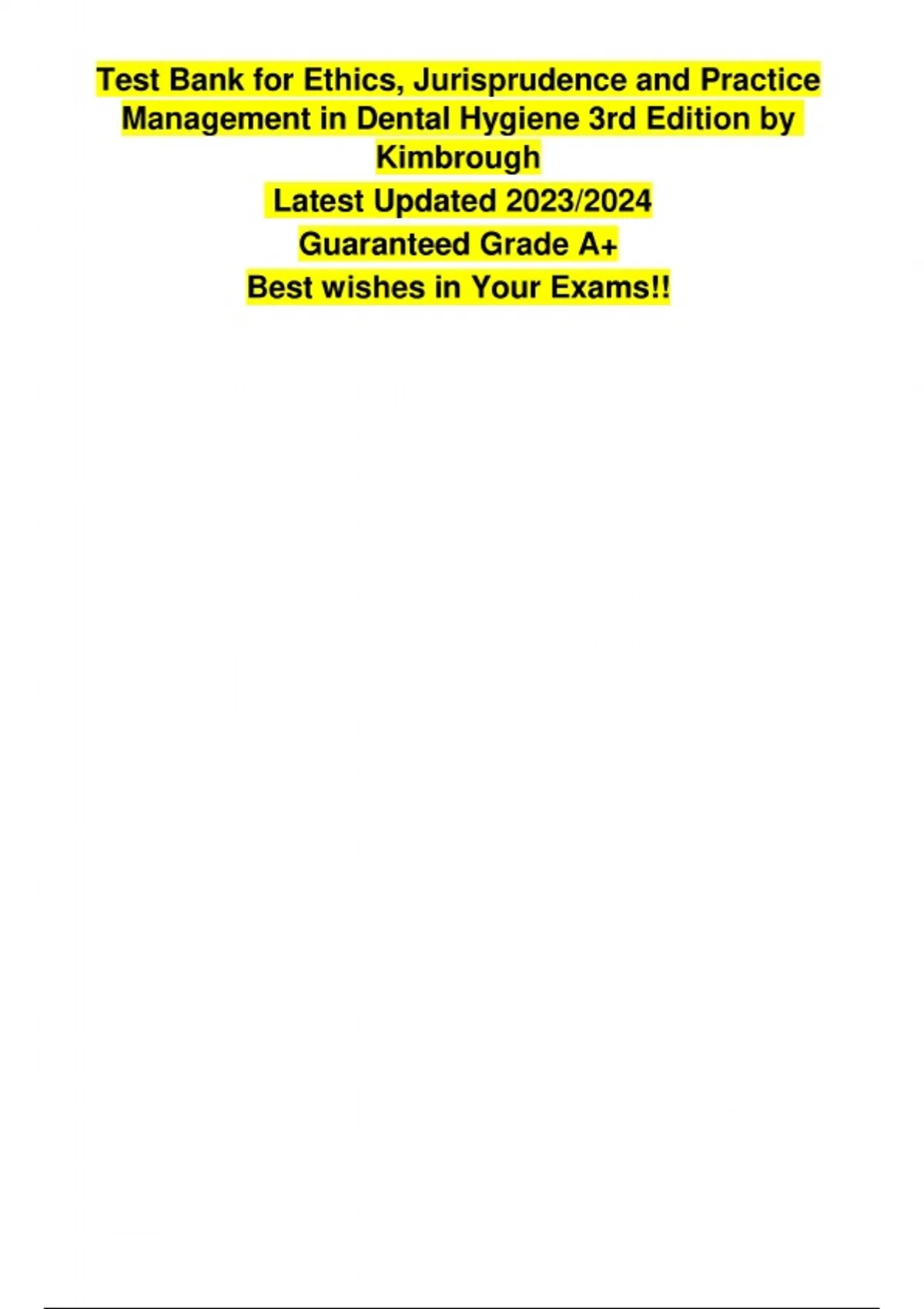 Test Bank for Ethics, Jurisprudence and Practice Management in Dental Hygiene (3rd Edition) by Kimbrough. Includes updated multiple-choice questions and answers for all chapters. Ideal for exam prep, NBDE review, and dental hygiene courses.