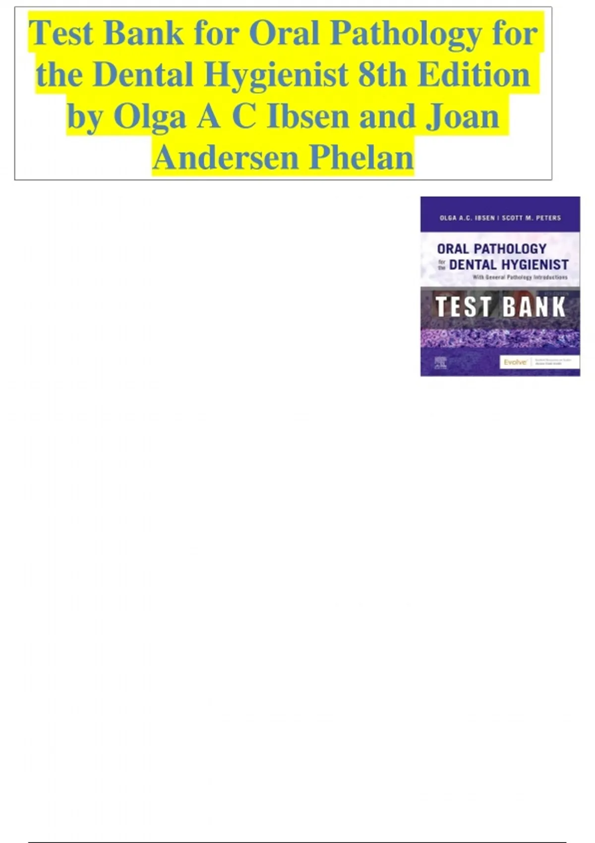 test bank for Oral Pathology for the Dental Hygienist (8th Edition) by Olga A. C. Ibsen and Joan Andersen Phelan. Includes multiple-choice questions and answers covering all textbook chapters — ideal for exam prep, quizzes, and dental hygiene review.