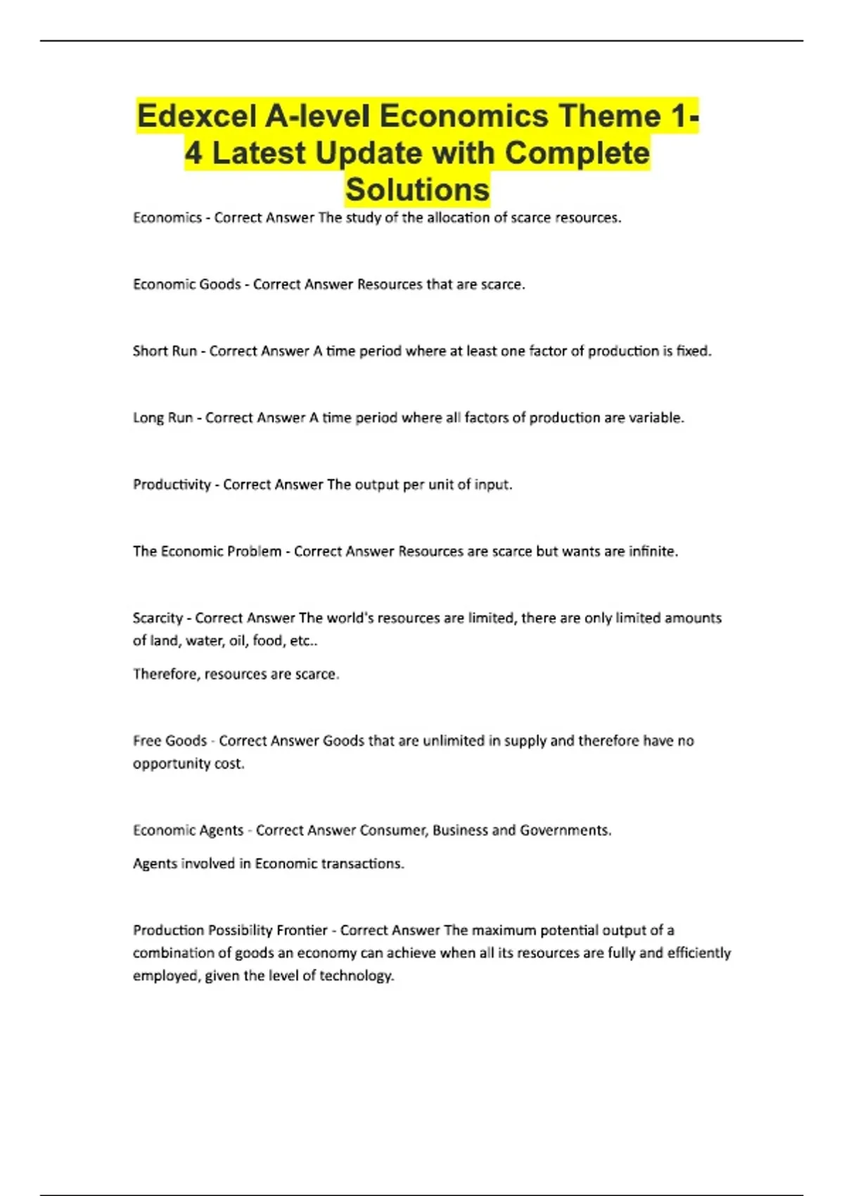 Edexcel A-level Economics Theme 1-4 Latest Update with Complete Solutions Economics - Correct Answer The study of the allocation of scarce resources. Economic Goods - Correct Answer Resources that are scarce. Short Run - Correct Answer A time period where at least one factor of production is fixed. Long Run - Correct Answer A time period where all factors of production are variable. Productivity - Correct Answer The output per unit of input. The Economic Problem - Correct Answer Resources are scarce but wants are infinite. Scarcity - Correct Answer The world's resources are limited, there are only limited amounts of land, water, oil, food, etc.. Therefore, resources are scarce. Free Goods - Correct Answer Goods that are unlimited in supply and therefore have no opportunity cost. Economic Agents - Correct Answer Consumer, Business and Governments. Agents involved in Economic transactions. Production Possibility Frontier - Correct Answer The maximum potential output of a combination of goods an economy can achieve when all its resources are fully and efficiently employed, given the level of technology. Opportunity Cost - C