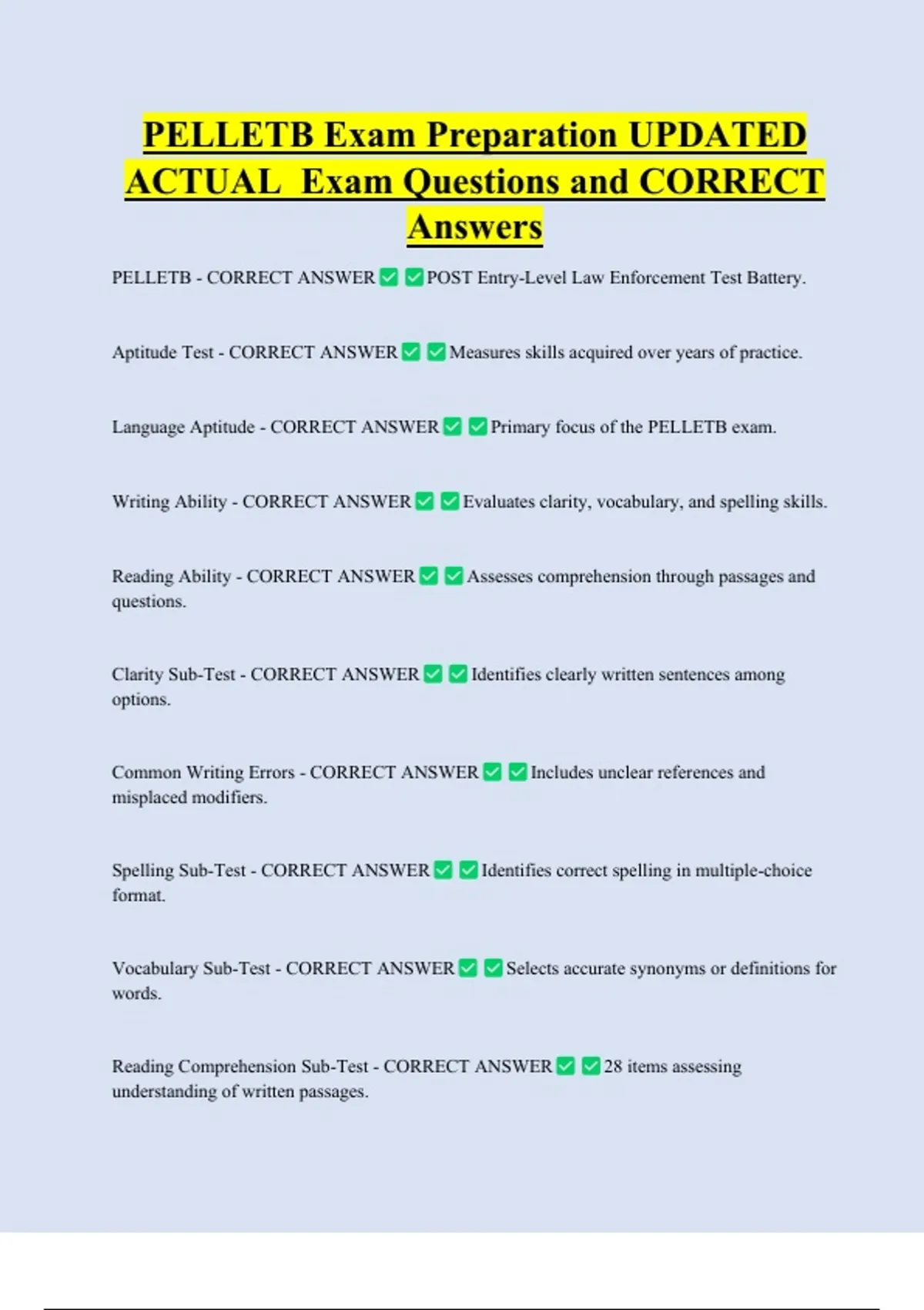 PELLETB - CORRECT ANSWER Entry-level law enforcement test battery.
