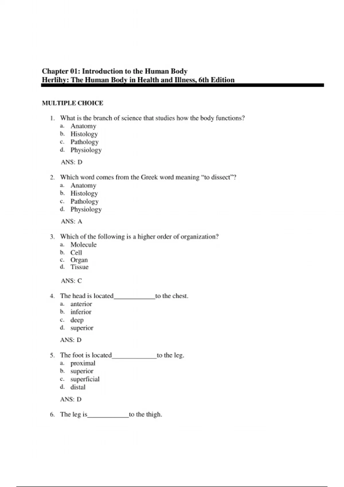 test bank for The Human Body in Health and Illness (6th Edition) by Barbara Herlihy. Contains chapter-by-chapter multiple-choice questions with correct answers — ideal for anatomy & physiology, nursing, and healthcare students preparing for exams and quizzes.