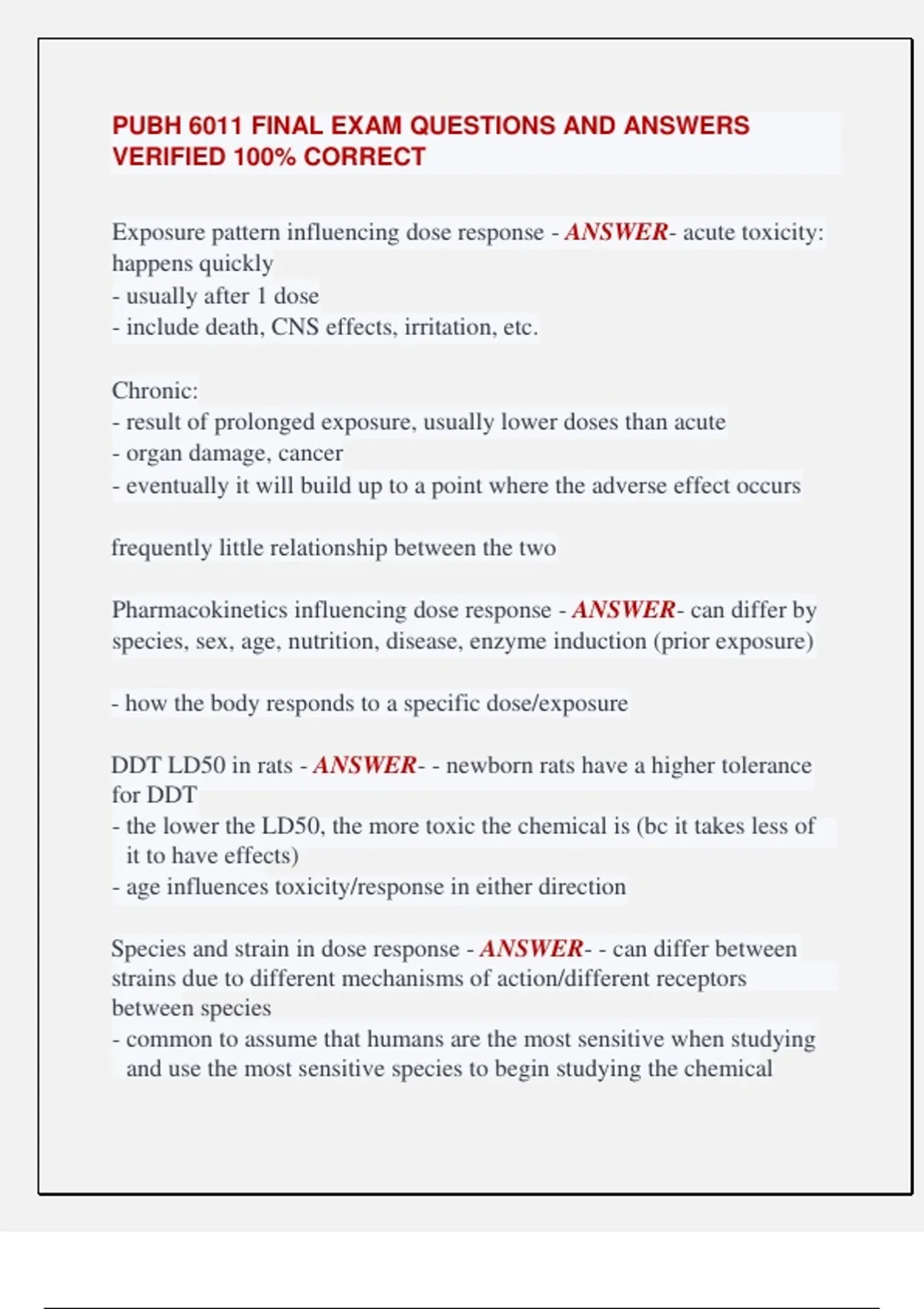 Exposure pattern influencing dose response - ANSWER- acute toxicity: