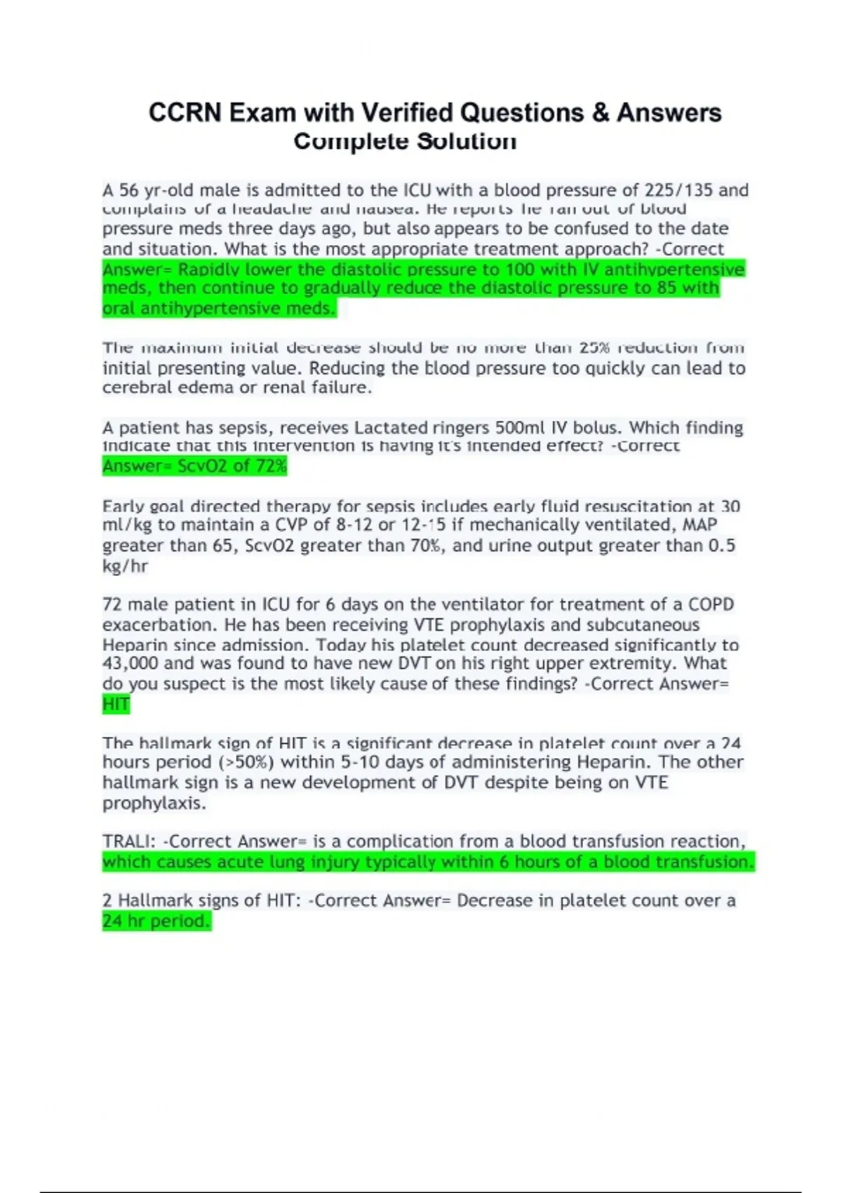 CCRN Exam with Verified Questions & Answers Complete Solution A 56 yr-old male is admitted to the ICU with a blood pressure of 225/135 and complains of a headache and nausea. He reports he ran out of blood pressure meds three days ago, but also appears to be confused to the date and situation. What is the most appropriate treatment approach? -Correct Answer= Rapidly lower the diastolic pressure to 100 with IV antihypertensive meds, then continue to gradually reduce the diastolic pressure to 85 with oral antihypertensive meds. The maximum initial decrease should be no more than 25% reduction from initial presenting value. Reducing the blood pressure too quickly can lead to cerebral edema or renal failure. A patient has sepsis, receives Lactated ringers 500ml IV bolus. Which finding indicate that this intervention is having it's intended effect? -Correct Answer= ScvO2 of 72% Early goal directed therapy for sepsis includes early fluid resuscitation at 30 ml/kg to maintain a CVP of 8-12 or 12-15 if mechanically ventilated, MAP greater than 65, ScvO2 greater than 70%, and urine output greater than 0.5 kg/hr 72 male patient in ICU for 6 days on the ventilator for treatment of a COPD exacerbation. He has been receiving VTE prophylaxis and subcutaneous Heparin since admission. Today his platelet count decreased significantly to 43,000 and was found to have new DVT on his right upper extremity. What do you suspect is the most likely cause of these findings? -Correct Answer= HIT The hallmark sign of HIT is a significant decrease in platelet count over a 24 hours period (50%) within 5-10 days of administering Heparin. The other hallmark sign is a new development of DVT despite being on VTE prophylaxis. TRALI: -Correct Answer= is a complication from a blood transfusion reaction, which causes acute lung injury typically within 6 hours of a blood transfusion. 2 Hallmark signs of HIT: -Correct Answer= Decrease in platelet count over a 24 hr period. New development of DVT despite being on VTE prophylaxis. Values in Early compensated Hypovolemic shock? -Correct Answer= CO 4.0 L/min, HR 135, SV 65, SVR 1700, MAP 65 In hypovolemic states, circulating volume is depleted therefore preload and contractility are decreased which leads to a decrease in SV and CO. HR and SV increase as compensatory measure to preserve CO, MAP and cerebral perfusion. Post-renal failure values: -Correct Answer= Urine output 200; urine sodium 30; BUN: Creatinine ratio 15:1; urine specific gravity 1.010 BUN: Creatinine ratio is 15:1, but both the BUN & creatinine are elevated. Urine sodium is typically 1-40 mEq/L. What to do in the event of HIT: -Correct Answer= Stop Heparin and administer an alternative direct thrombin inhibitor. Warfarin is contraindicated in HIT? T/F -Correct Answer= True - there is also no evidence that shows protamine, corticosteroids, and benadryl are effective treatments for HIT Patients with right ventricular infarctions become preload dependent. Meds that decrease preload should be avoided - which meds are these? -Correct Answer= Morphine, Nitro, Beta blockers and diuretics. Polymorphic ventricular tachycardia aka Torsades is treated by? -Correct Answer= Magnesium Myocardial contusions generally impact which parts of the heart? and what would the values be? -Correct Answer= Atria & right ventricle because of the position of the heart in the chest. PAOP 6, PA Pressure 40/24, RA Pressure 16 Neurogenic shock signs? -Correct Answer= CVP: 3, CI: 2.5, SVR: 650, SBP: 88 Neuro shock is associated with a loss of sympathetic tone causing extensive peripheral vasodilation. Clinical signs and symptoms include hypotension, a low SVR, low CVP and low normal CI What causes a larger than normal A wave on a PAOP? -Correct Answer= Mitral stenosis - causes increased left atrial pressure during atrial contraction. Pulmonary HTN will result in what? -Correct Answer= Elevated PA pressures but have no impact on PAOP. Infective Endocarditis can cause what kind of impairment? -Correct Answer= Neurologic impairment. One of the risks of infective endocarditis is the bacterial strand breaking in the heart and throwing bacterial emboli forward into the lungs from the right side of the heart or to the brain/body from the left side of the heart. Neurologic impairment could be a sign? -Correct Answer= Embolic ischemic stroke. Post bariatric surgery should avoid what kind of meds? -Correct Answer= Extended release meds due to absorption concerns post-operatively Chlorpropamide is a what? -Correct Answer= sulfonylurea drug that is used in DI as an antidiuretic. It is primarily a glucose lowering agent. (hypoglycemia) Will a cardiac transplant patient respond to atropine? -Correct Answer= No - pacing is the best instrument for symptomatic bradycardia. Elevated urine osmolality; decreased serum osmolality; and decreased serum sodium is what symptom? -Correct Answer= SIADH - causes retention of water. Urine production is minimal and concentrated & leads to an increased urine osmolality. What does Neo drug increase? -Correct Answer= SVR - Peripheral constriction Treatment for narrow complex, regular rhythm? -Correct Answer= Administer 6mg adenosine rapidly IVP Half life of metformin? -Correct Answer= 6 hours - close monitoring is required to ensure the blood glucose level does not climb too quickly while dextrose is being administered. Most accurate reflection of daily fluid balance? -Correct Answer= Record a daily weight at the same time each day. Wide mediastinum on chest x-ray, narrow pulse pressure, and hypotension are signs of what? -Correct Answer= Cardiac tamponade A patient with hyponatremia would need what? -Correct Answer= Help maintaining a safe environment. HypoNa impairs judgment, and causes confusion. Peritoneal dialysis works on the principles of both? -Correct Answer= Diffusion and osmosis. HHNS leads to what? -Correct Answer= Large fluid deficits and may require multiple liters of fluid, which is determined by the patient's leve