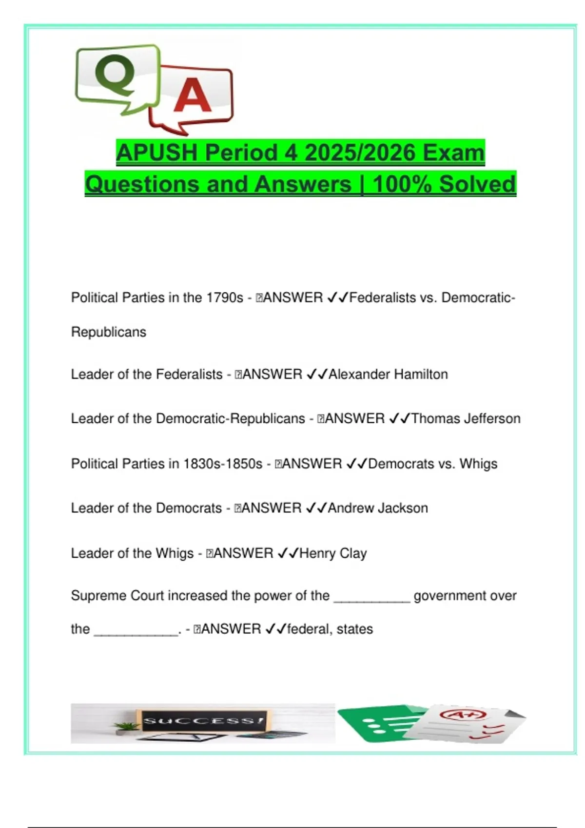 Leader of the Democrats - 🧠ANSWER ✔✔Andrew Jackson
