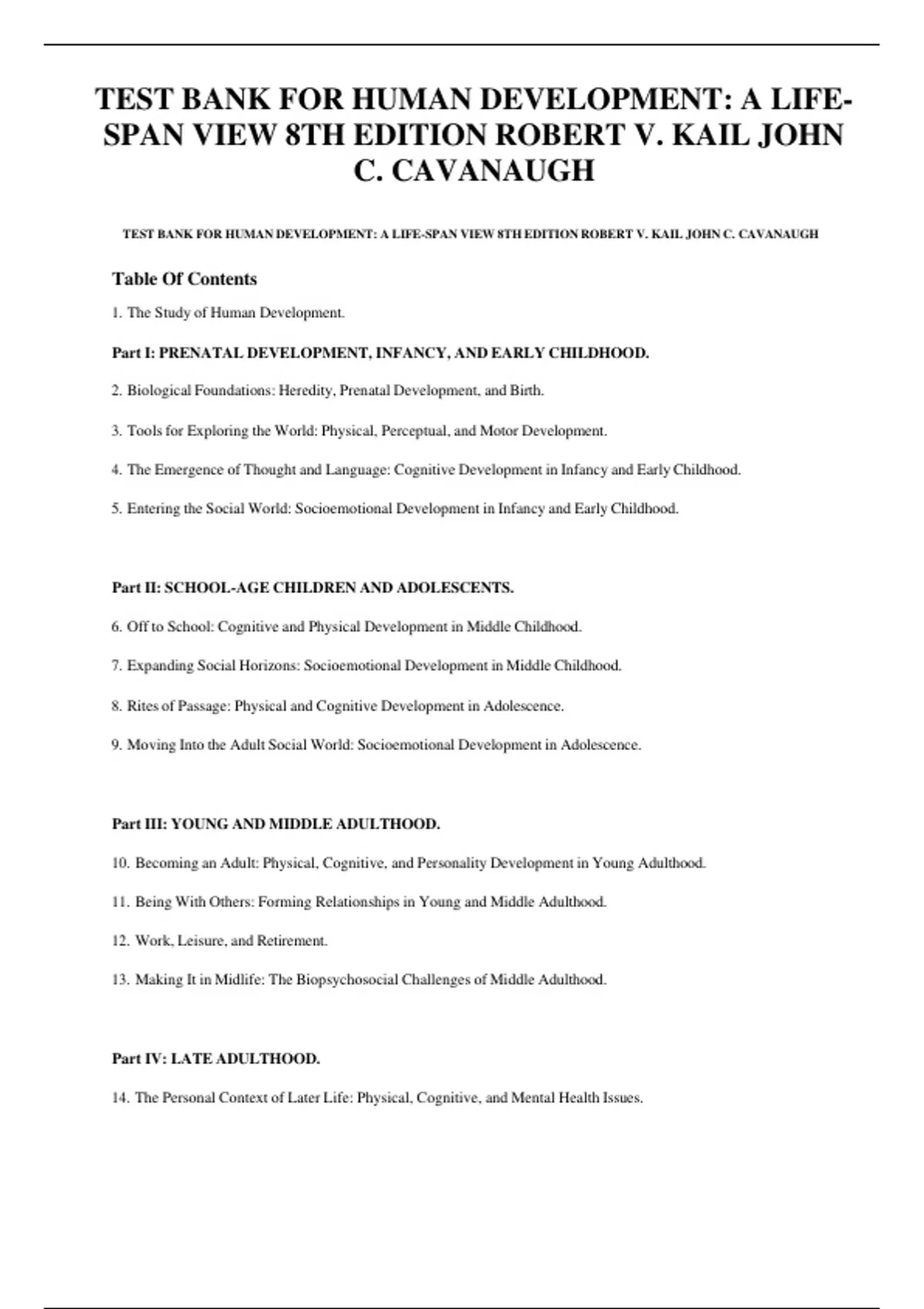 TEST BANK FOR HUMAN DEVELOPMENT: A LIFE-SPAN VIEW 8TH EDITION ROBERT V. KAIL JOHN C. CAVANAUGH