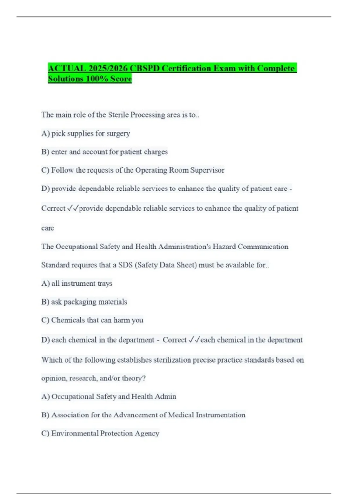 ACTUAL 2025/2026 CBSPD Certification Exam with Complete Solutions 100% Score The main role of the Sterile Processing area is to.. A) pick supplies for surgery B) enter and account for patient charges C) Follow the requests of the Operating Room Supervisor D) provide dependable reliable services to enhance the quality of patient care - Correct provide dependable reliable services to enhance the quality of patient care The Occupational Safety and Health Administration's Hazard Communication Standard requires that a SDS (Safety Data Sheet) must be available for.. A) all instrument trays B) ask packaging materials C) Chemicals that can harm you D) each chemical in the department - Correct each chemical in the department