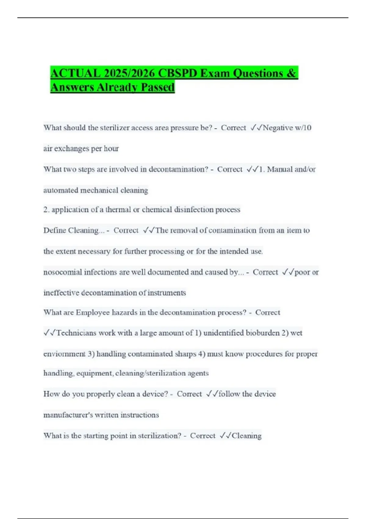 ACTUAL 2025/2026 CBSPD Exam Questions & Answers Already Passed What should the sterilizer access area pressure be? - Correct Negative w/10 air exchanges per hour What two steps are involved in decontamination? - Correct 1. Manual and/or automated mechanical cleaning 2. application of a thermal or chemical disinfection process Define Cleaning... - Correct The removal of contamination from an item to the extent necessary for further processing or for the intended use. nosocomial infections are well documented and caused by... - Correct poor or ineffective decontamination of instruments What are Employee hazards in the decontamination process? - Correct