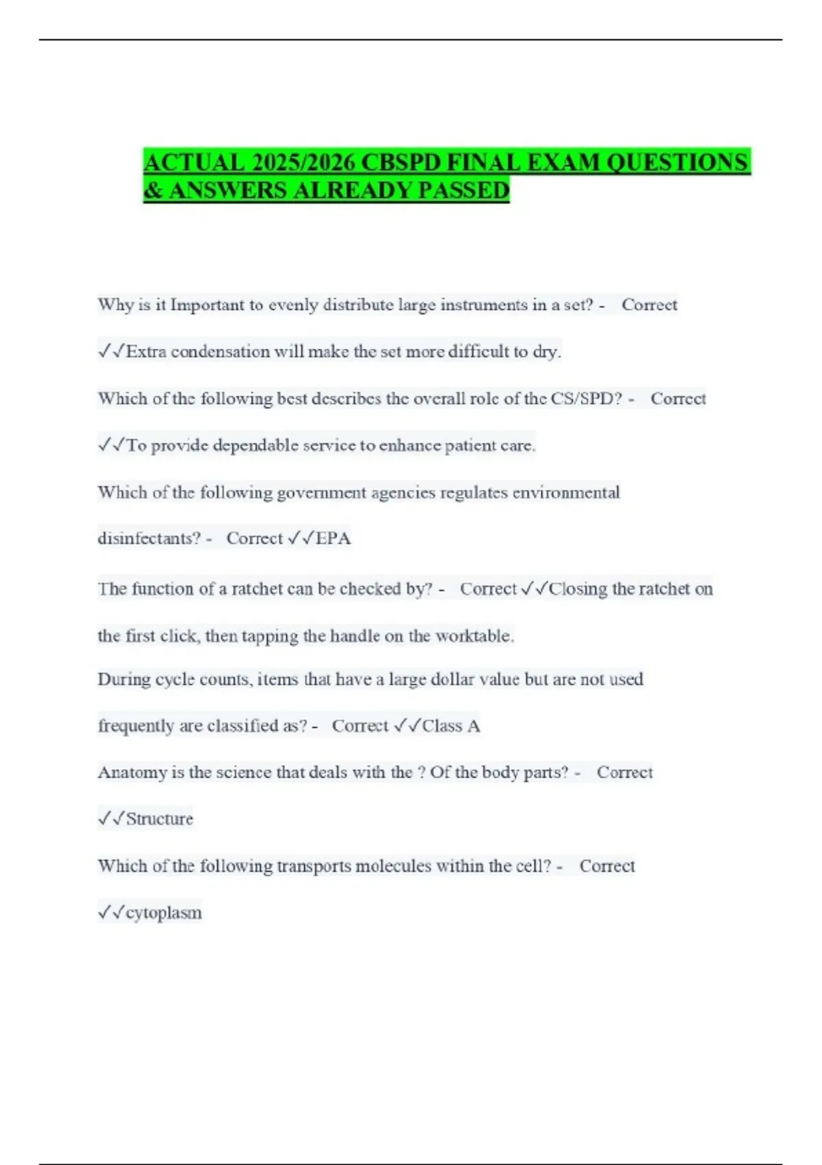 ACTUAL 2025/2026 CBSPD FINAL EXAM QUESTIONS & ANSWERS ALREADY PASSED Why is it Important to evenly distribute large instruments in a set? - Correct Extra condensation will make the set more difficult to dry. Which of the following best describes the overall role of the CS/SPD? - Correct To provide dependable service to enhance patient care. Which of the following government agencies regulates environmental disinfectants? - Correct EPA The function of a ratchet can be checked by? - Correct Closing the ratchet on the first click, then tapping the handle on the worktable. During cycle counts, items that have a large dollar value but are not used frequently are classified as? - Correct Class A