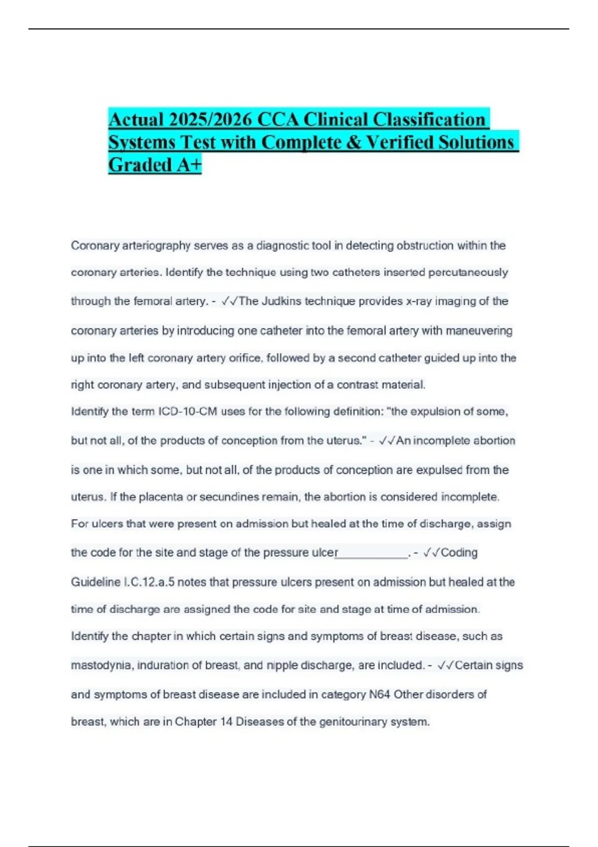 Actual 2025/2026 CCA Clinical Classification Systems Test with Complete & Verified Solutions Graded A+ Coronary arteriography serves as a diagnostic tool in detecting obstruction within the coronary arteries. Identify the technique using two catheters inserted percutaneously through the femoral artery. - The Judkins technique provides x-ray imaging of the coronary arteries by introducing one catheter into the femoral artery with maneuvering up into the left coronary artery orifice, followed by a second catheter guided up into the right coronary artery, and subsequent injection of a contrast material. Identify the term ICD-10-CM uses for the following definition: "the expulsion of some, but not all, of the products of conception from the uterus." - An incomplete abortion is one in which some, but not all, of the products of conception are expulsed from the uterus. If the placenta or secundines remain, the abortion is considered incomplete. For ulcers that were present on admission but healed at the time of discharge, assign the code for the site and stage of the pressure ulcer . - Coding