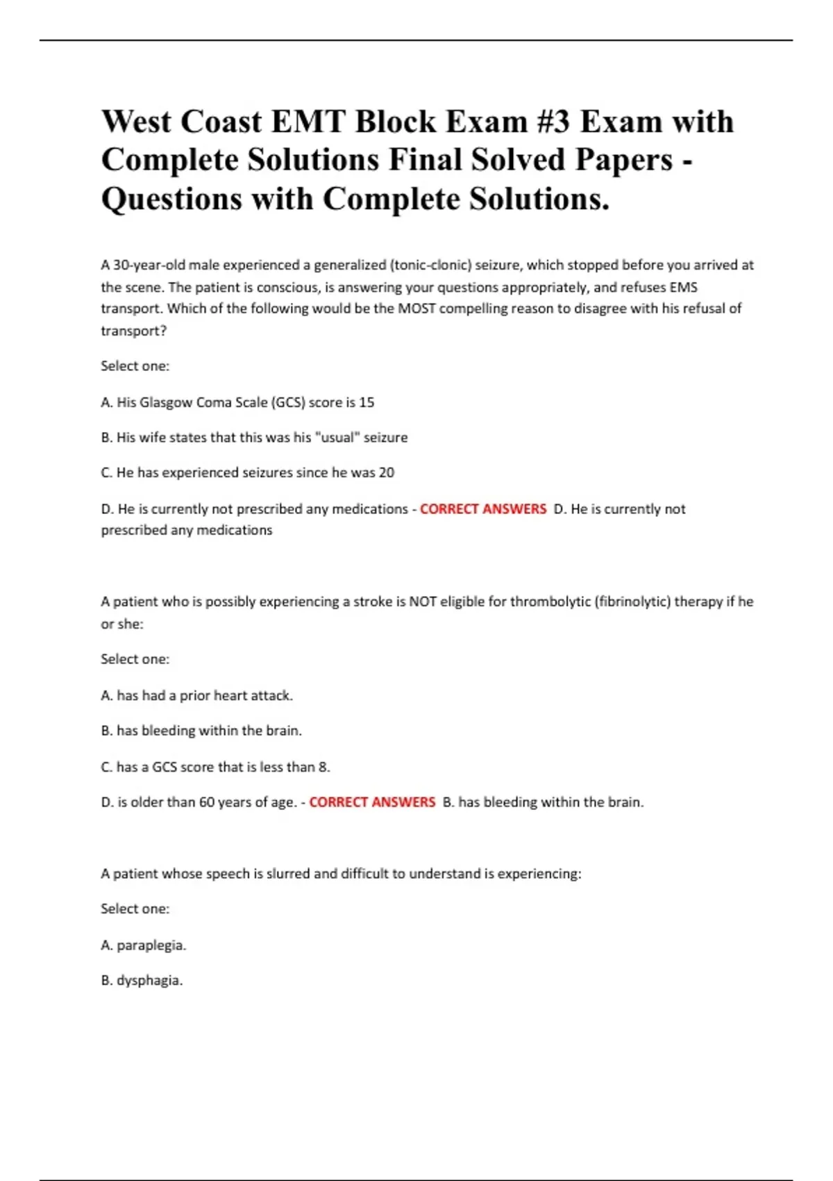 D. is older than 60 years of age. - CORRECT ANSWERS B. has bleeding within the brain.