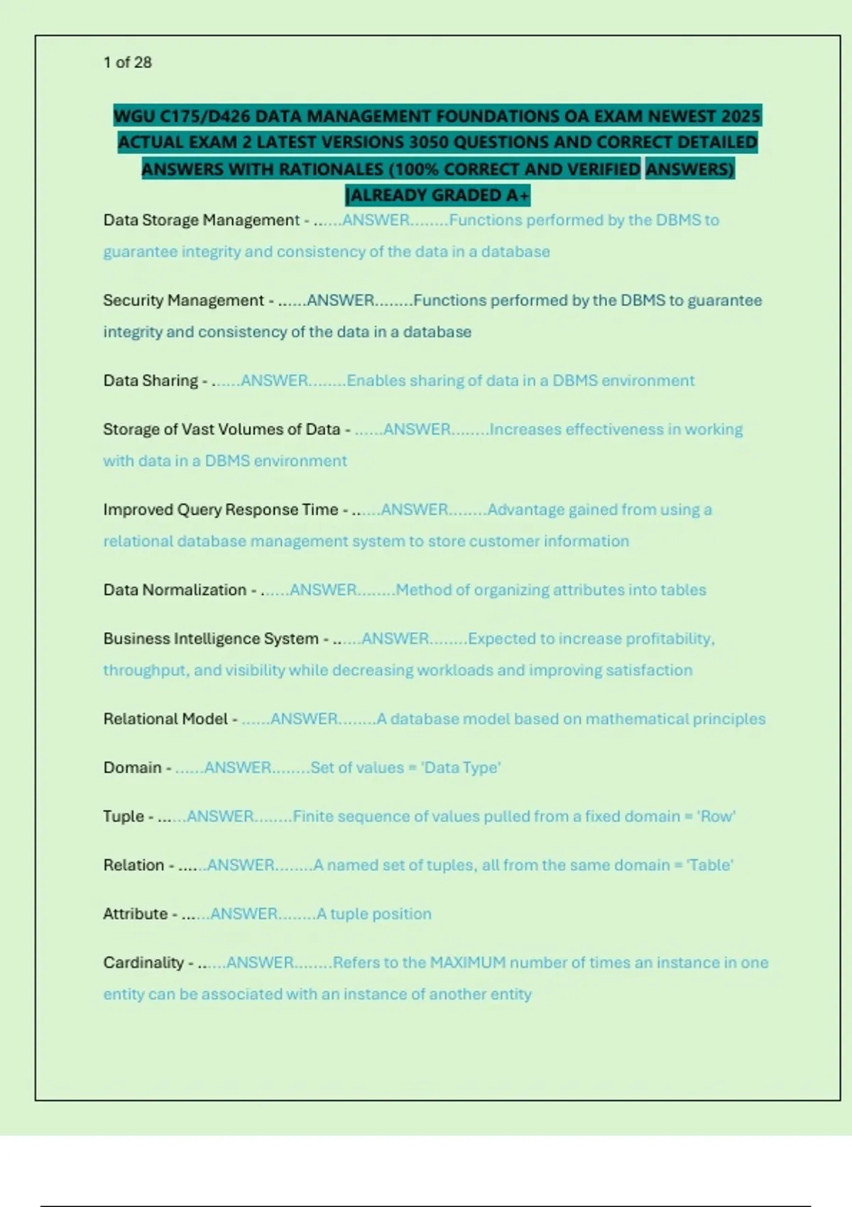 Prepare for the WGU C175/D426 Data Management Foundations Objective Assessment (OA) with this detailed exam guide. This resource includes 3050 actual exam questions and answers from the latest 2025 versions, complete with rationales and verified accuracy. Covering key topics such as data storage management, relational models, normalization, SQL commands, ETL processes, data warehousing, and more, this guide is designed to help you master the fundamentals of data management. Whether you're reviewing for the exam or strengthening your understanding of database principles, this document offers essential insights and practice to ensure success.